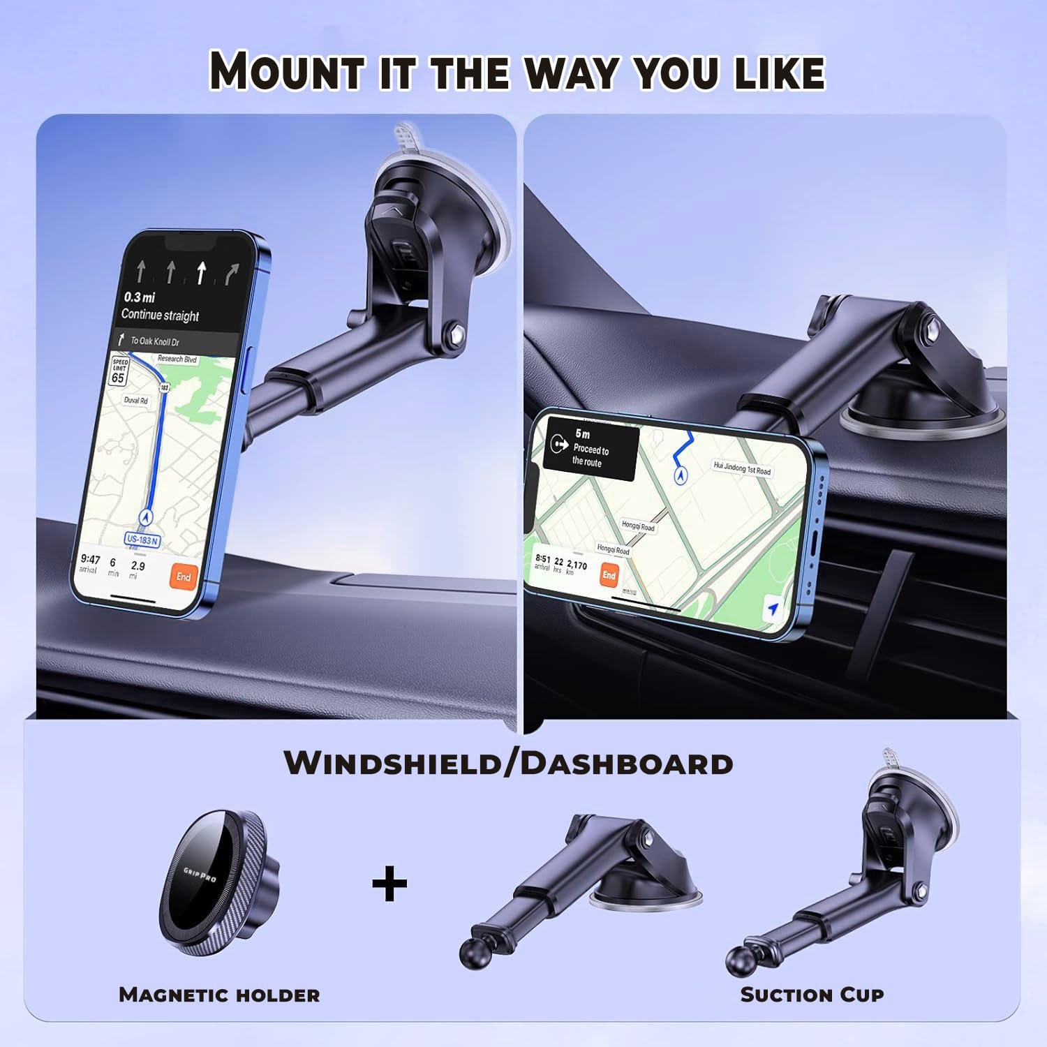 Flexible Adjustment in any Orientation – Designed with a telescopic arm with a 240° maximum angle adjustment, the magnetic car mount is widely rotatable in any angle you want for a safe driving experience, which lets you fully operate in phone height, distance, and orientation.