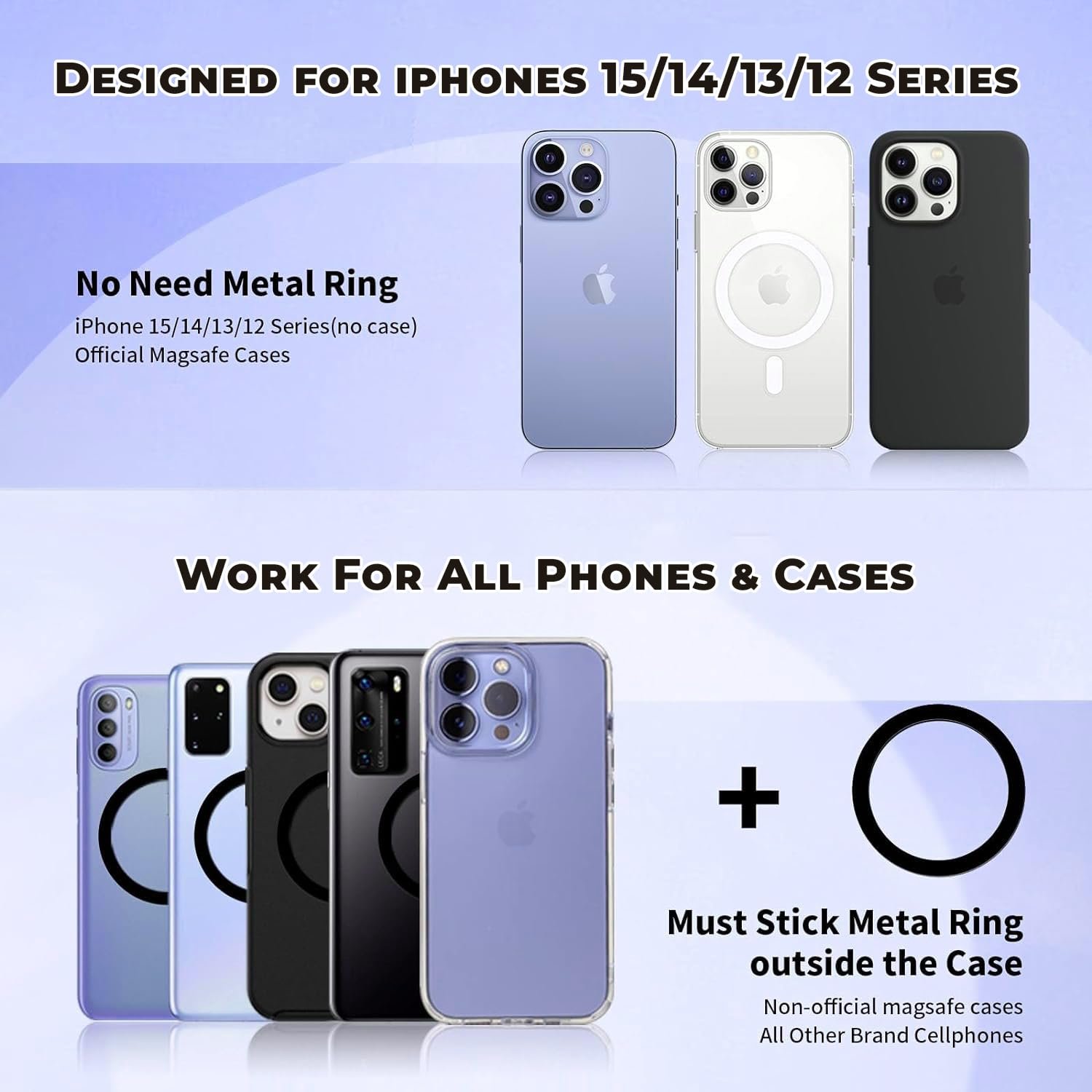 Tap and Mount: The 360° ring of magnets aligns perfectly with the magnetic system in the iPhone 12/13/14 series or later and works with a Magsafe-compatible case or without any back cover. Compatible with other phones using the provided magnet rings.
