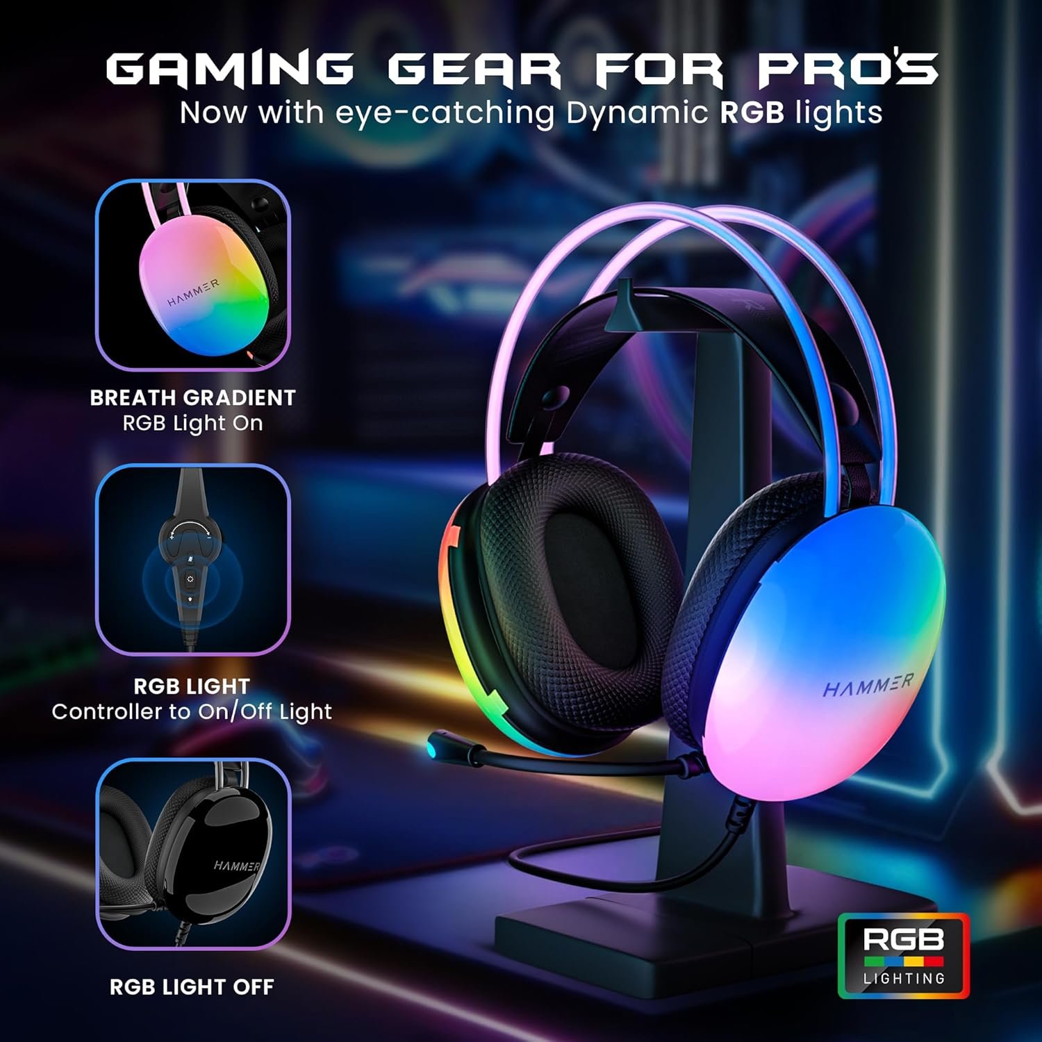 HAMMER Blaze Wired Over Ear Gaming Headphones with Mic, 50mm Drivers, Full RGB Lights, Gaming Headset with Adjustable Bands, Breathable earcushion, 1.5Mtr Wire with USB (Black)