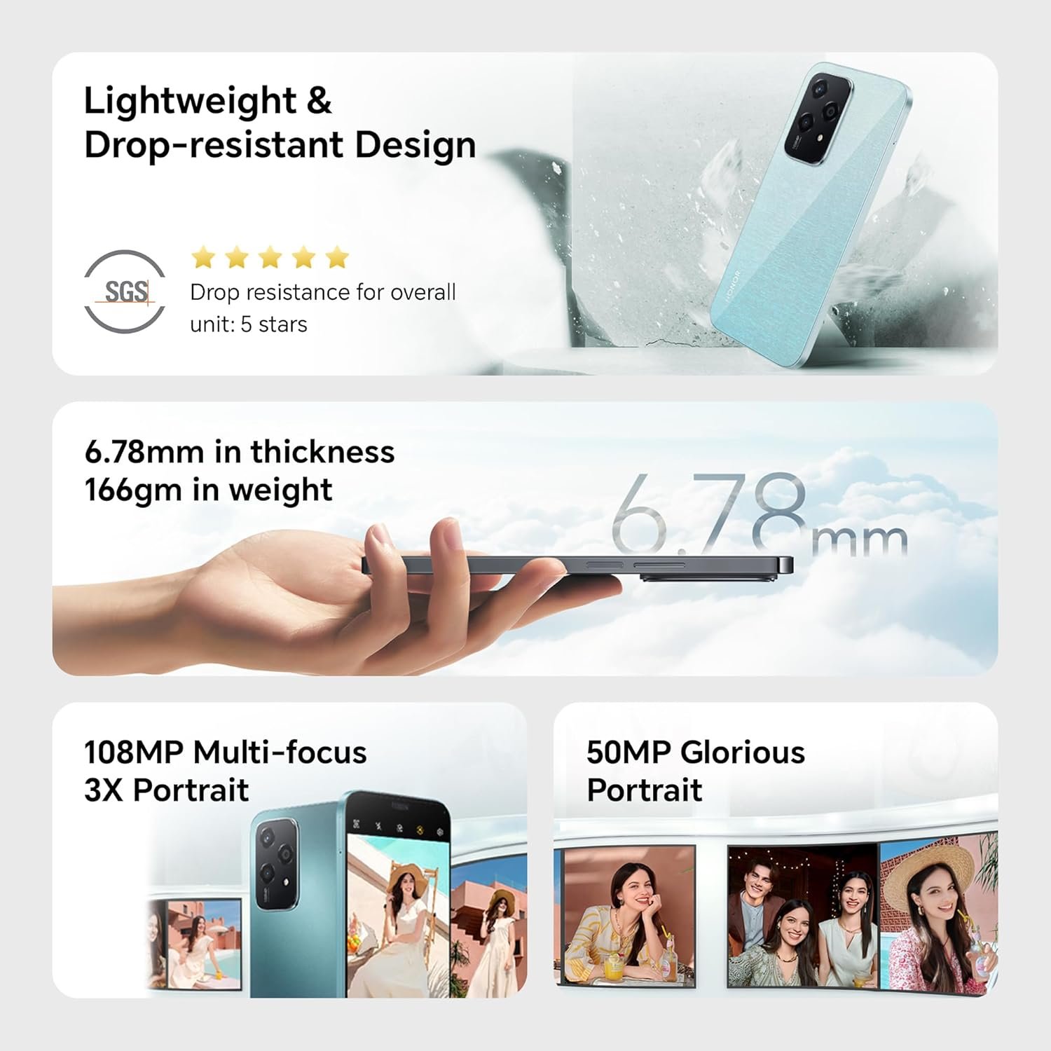 Camera Capabilities: 108MP Main + 5MP Wide & Depth + 2MP Macro Camera | 50MP AI Wide-angle Selfie Camera Equipped with Selfie Soft Light Technology | Upto 10x Digital Zoom | Video – 1080p@30fps | AI-powered Photography – Auto Scene Recognition and Image Optimization, Instantly turn memories into captivating movies with AI-supported Instant Movie Maker, AI-supported Auto-adjusting to Wide Angles