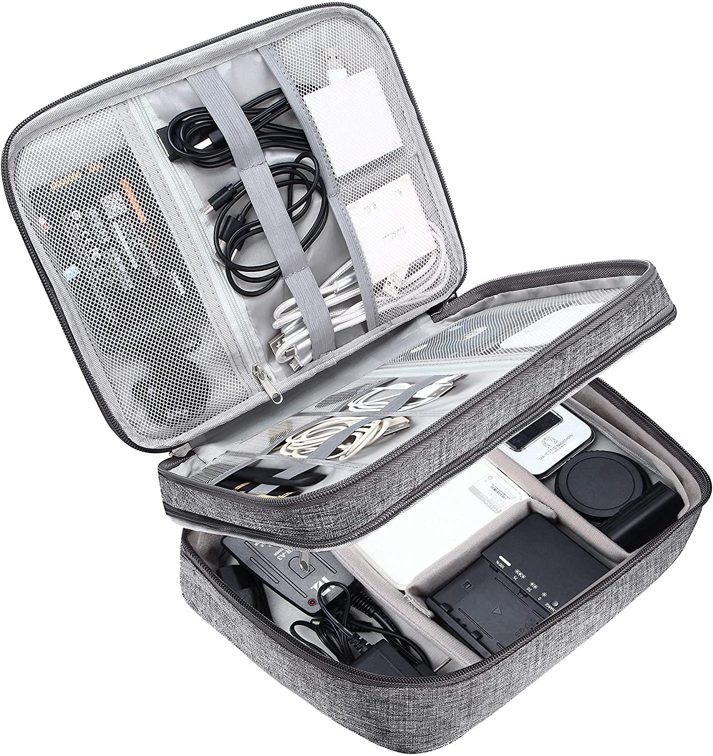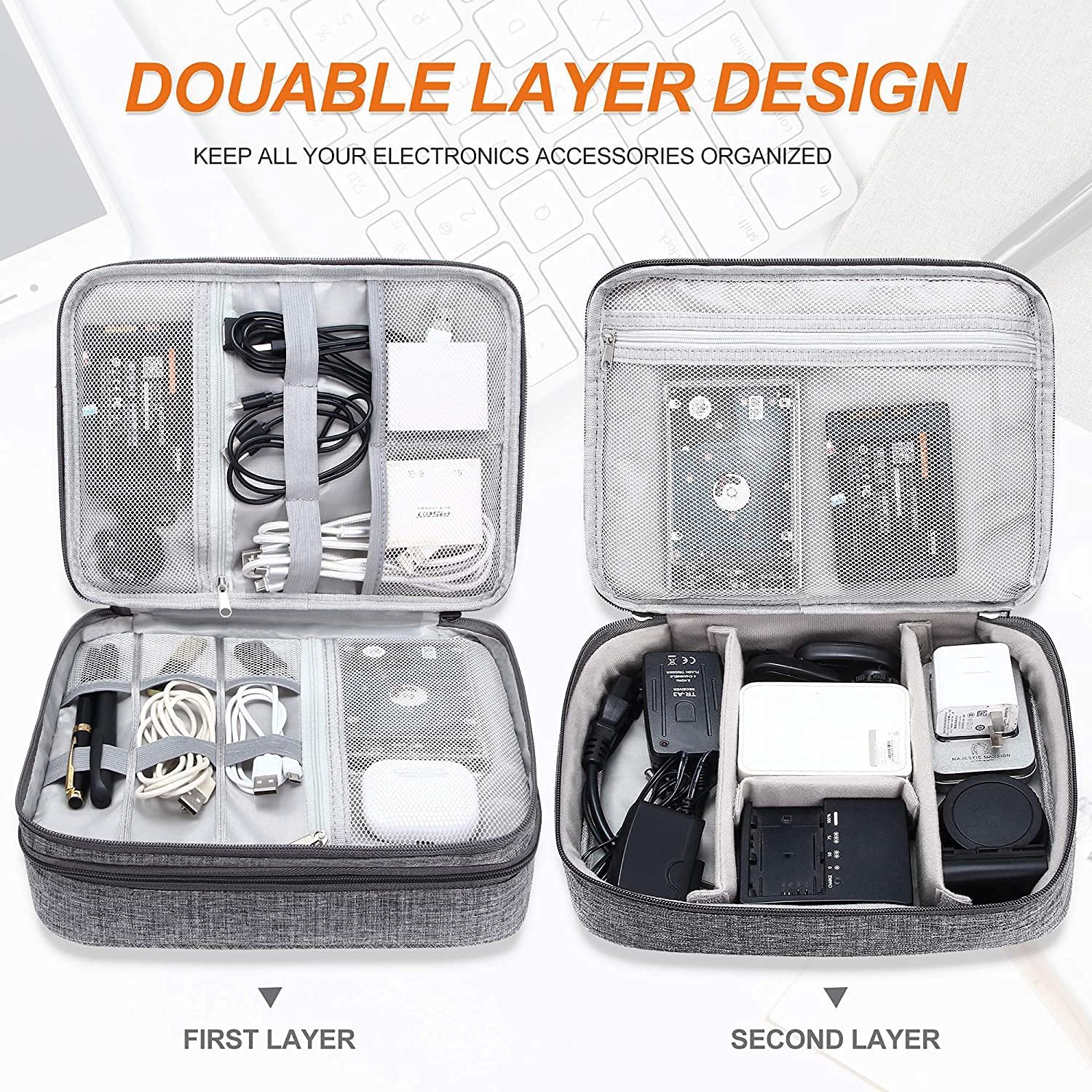 DOUBLE LAYER DESIGN: The electronics bag is designed with 2 Layers interior compartment, the upper compartment can be used to organize small items, like cables, USB, chargers, the lower partition to store larger items, like adapters, external hard drives, kindle and other travel accessories. Besides, the padded dividers are adjustable and you can adjust them for your needs.