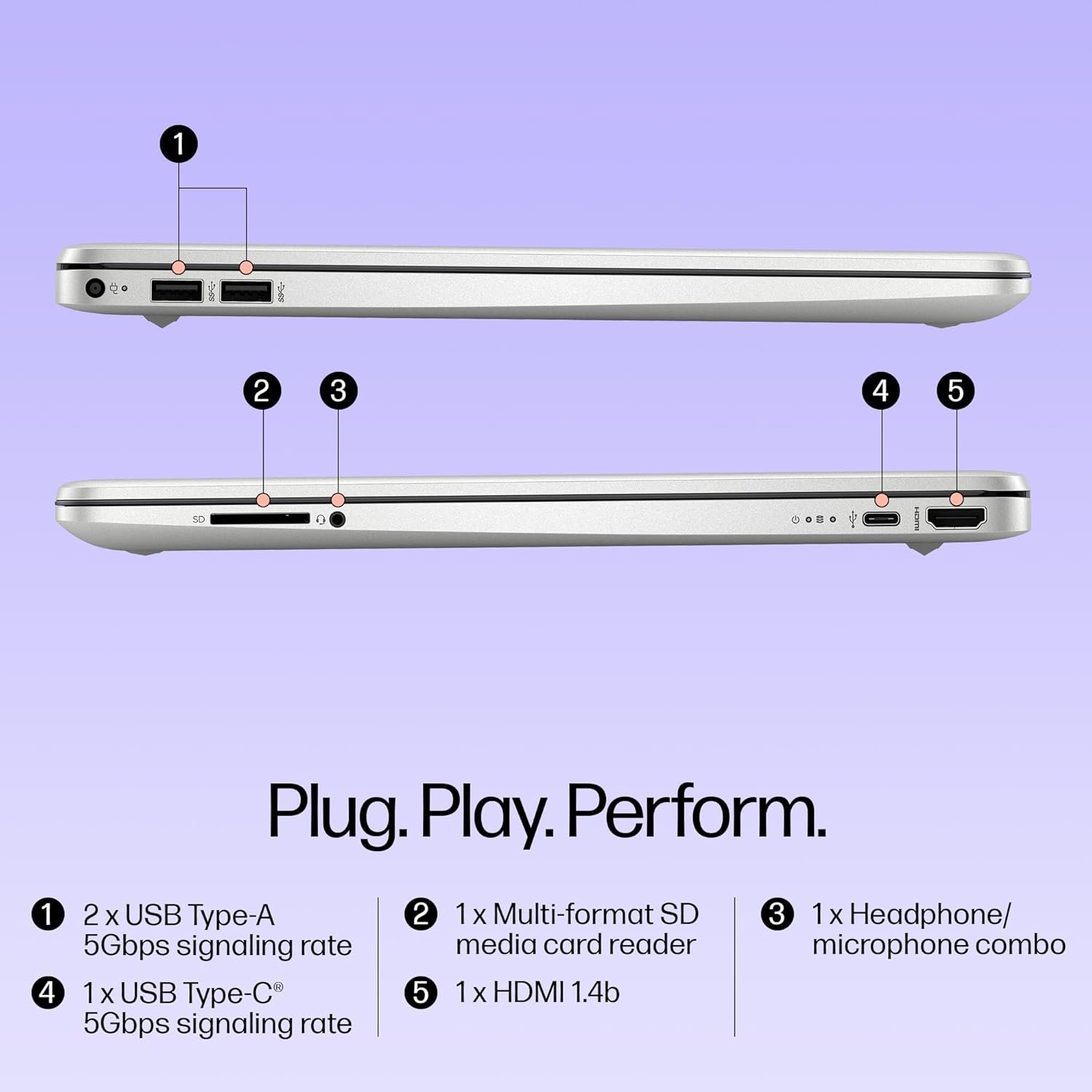 Ports -1 USB Type-C 5Gbps signaling rate (supports data transfer only and does not support charging or external monitors); 2 USB Type-A 5Gbps signaling rate; 1 AC smart pin; 1 HDMI 1.4b; 1 headphone/microphone combo