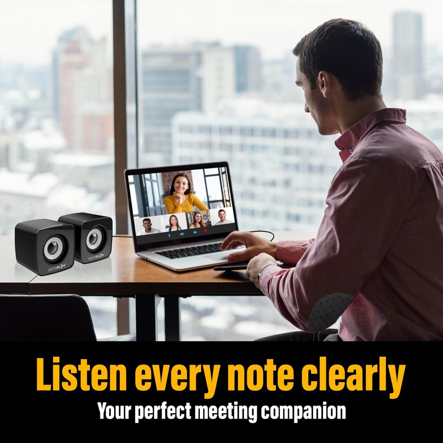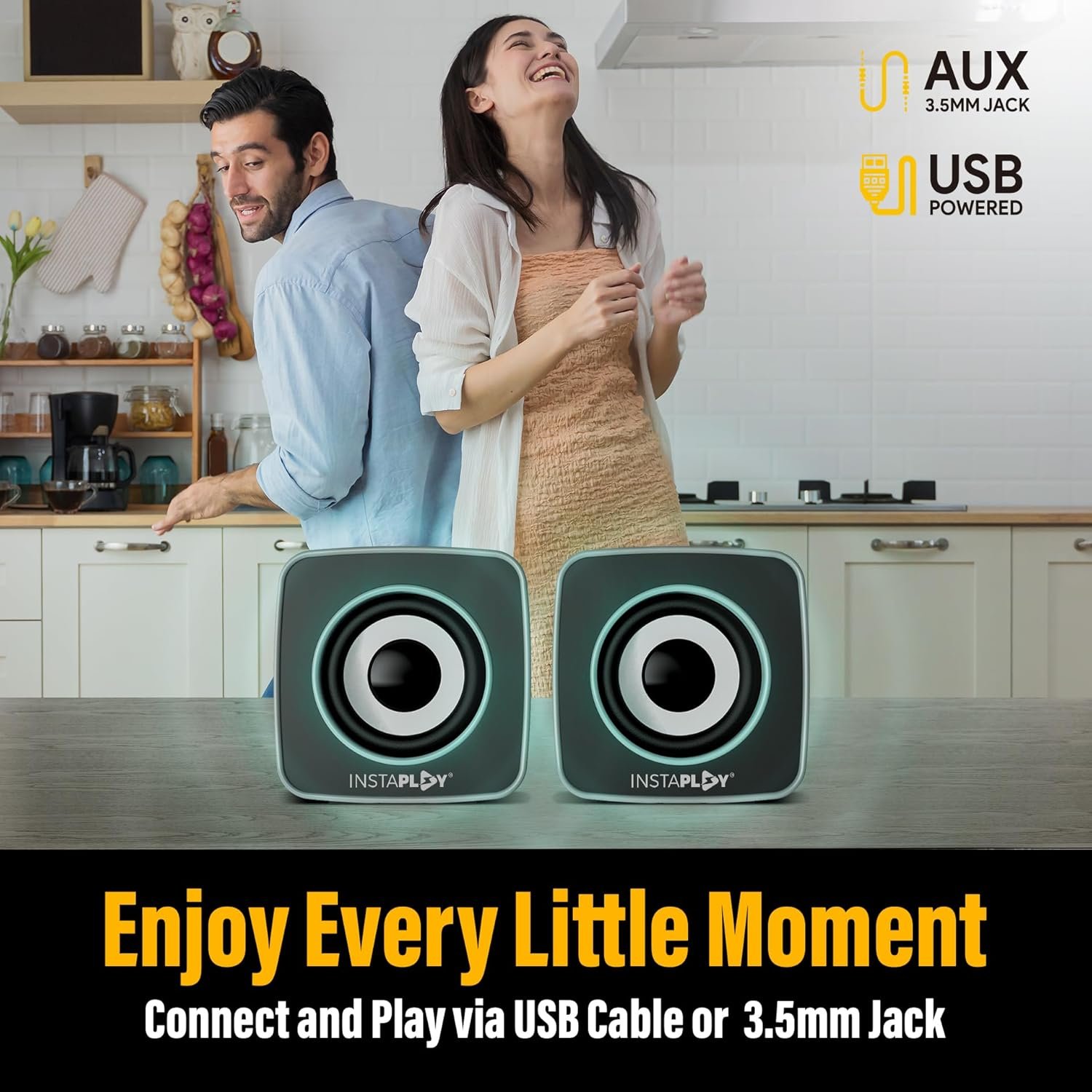 Feature: The INSTAPLAY INSTA DUO 2.0 Multimedia Speaker features AUX connectivity and a 3.5mm jack, allowing seamless connection with a wide range of devices.