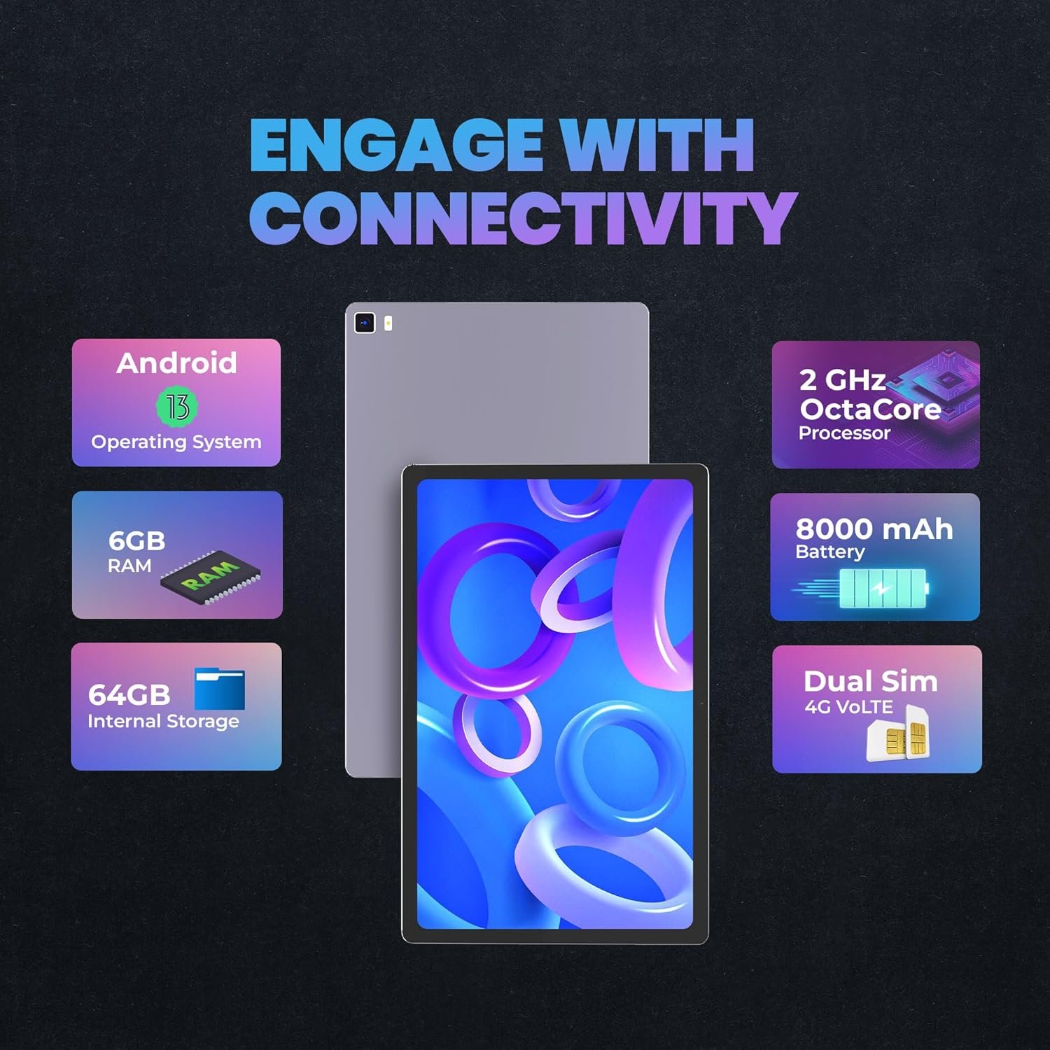 Display: Size: 10.4 inches, Resolution: 2000×1200 pixels, Type: IPS HD Display, Refresh Rate: 60Hz, Brightness: 450 Nits, DPI: 240dpi, Operating System: Android 13Processor: Speed: 2.0 GHz, Core: 8 Octa Core, Architecture: 64 Bit, Make: Spreadtrum – UNISOC T616, GPU: Mali – G57Memory: RAM: 6GB LPDDR4, ROM: 64GB (Expandable up to 1TB via SD card)Camera: Rear: 13MP with flash, auto-focus, geotagging, FHD 1080p video recording at 30fps, Front: 8MP, HD 720p video recording at 30fps Battery: Capacity: 8000mAh non-removable, Connectivity: 4G LTE, Dual SIM, Wi-Fi (802.11a/b/g/n, 2.4GHz + 5GHz), Bluetooth 5.0, GPS, AGPS Dimensions & Weight: Dimensions: 156 x 247 x 09 mm, Weight: 500 grams (with keyboard: 960 grams), Sensors: Accelerometer, Rotational Vectors Ports: USB Type C, Audio Type C, Color: Grey, Build: P+G (Plastic and Glass).
