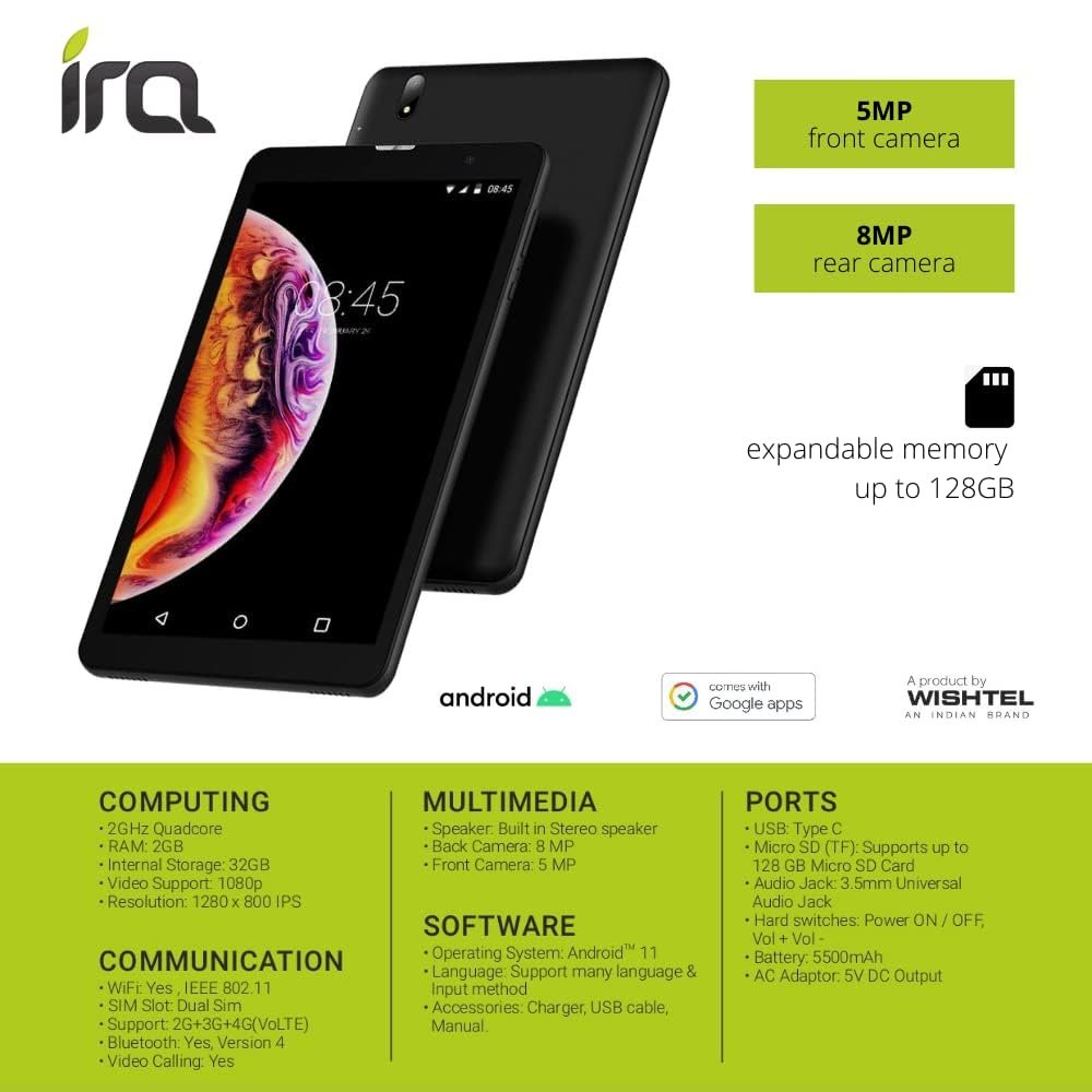 Display: 8-inch IPS Display, 1280×800 resolution, 56Hz refresh rate, 300 nits brightnessOperating System: Android 11 / 13Connectivity: WiFi + 4G/LTE, Dual SIM, GPS, AGPSProcessor: 2.0 GHz Quad-Core, 64-bit, Spreadtrum – UNISOC T310, PowerVR Rogue GE8300 GPURAM: 2GB LPDDR4Storage: 32GB internal storage, expandable up to 512GBRear Camera: 8 MP with flash, auto-focus, 1080p video recordingFront Camera: 5 MP, 720p video recordingBattery: 5500mAh non-removable batteryDimensions: 208x127x09 mm, 320 gramsSensors: Accelerometer, no light sensor, no gravity sensor, no proximity sensor, no gyroscope sensor, rotational vectors supportGMS: Google Mobile Service certifiedAccessories: Adapter, USB, OTG cable, flip cover, earphonesMiscellaneous: USB Type-C port, 3.5mm audio jack, dual stereo speakers