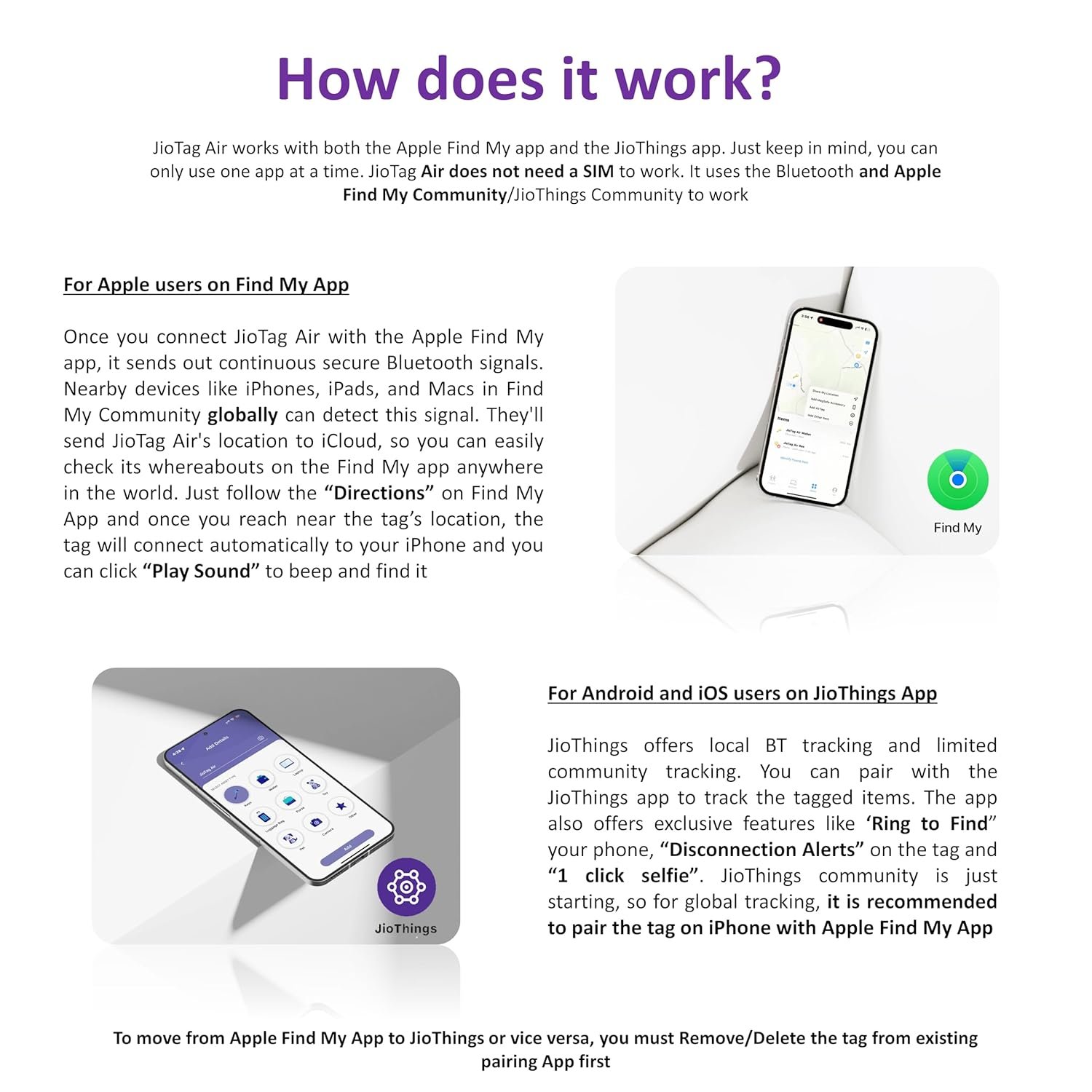 Works with the JioThings App available on the Google Play Store and Apple App Store. However only one App can be used to pair at a time. Either Apple Find My App or JioThings App. Global Tracking fully works on Apple Find My App only