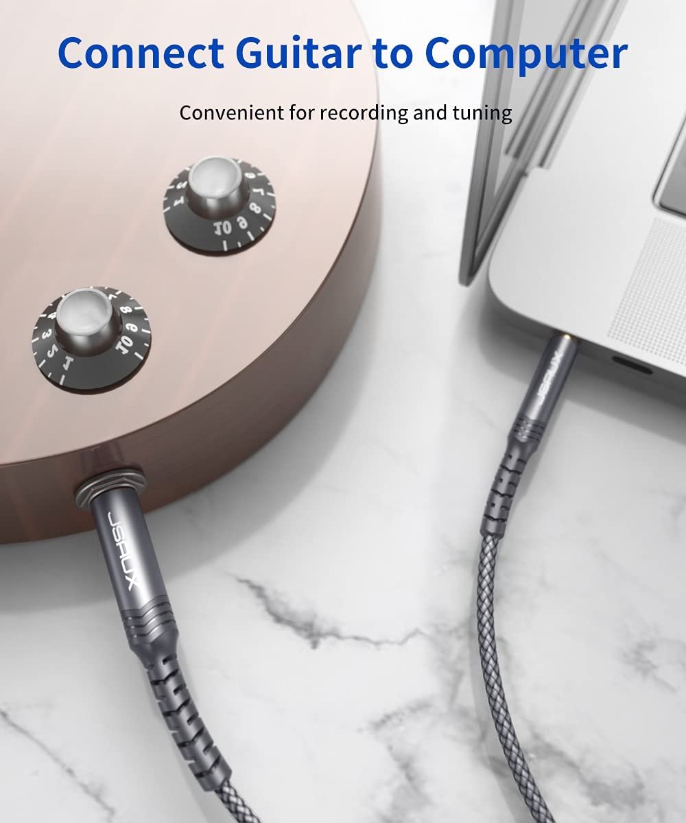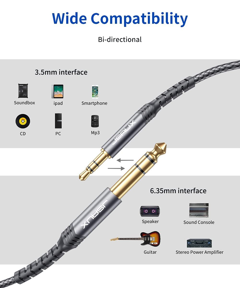 PLUG AND PLAY: JSAUX 3.5mm Male Jack to 1/4 inch male cable connects smartphones, tablets, iPods, or headphones with standard 3.5mm ports to audio devices with a 6.35mm stereo port. Eg: piano keyboard to 3.5mm adapter, guitar to speaker adapter, amplifier to headphones adapter, 6.35mm headphones to computer adapter.