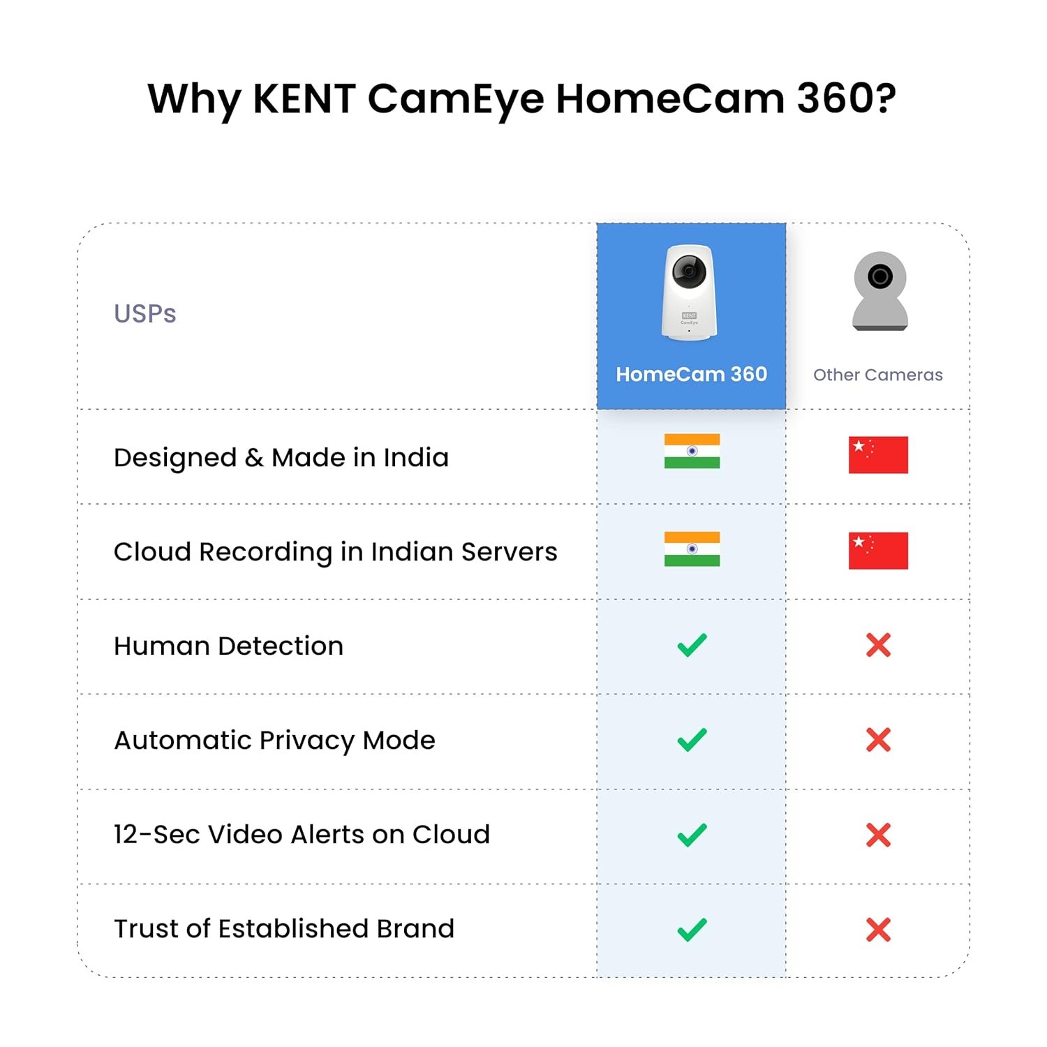 KENT CamEye HomeCam Wi-Fi 360 (1N), Adapter (1N), USB Cable (1N). Engineered to perfection, it is packed with a host of useful features. Moreover, it features a sleek design that makes it even more desirable.