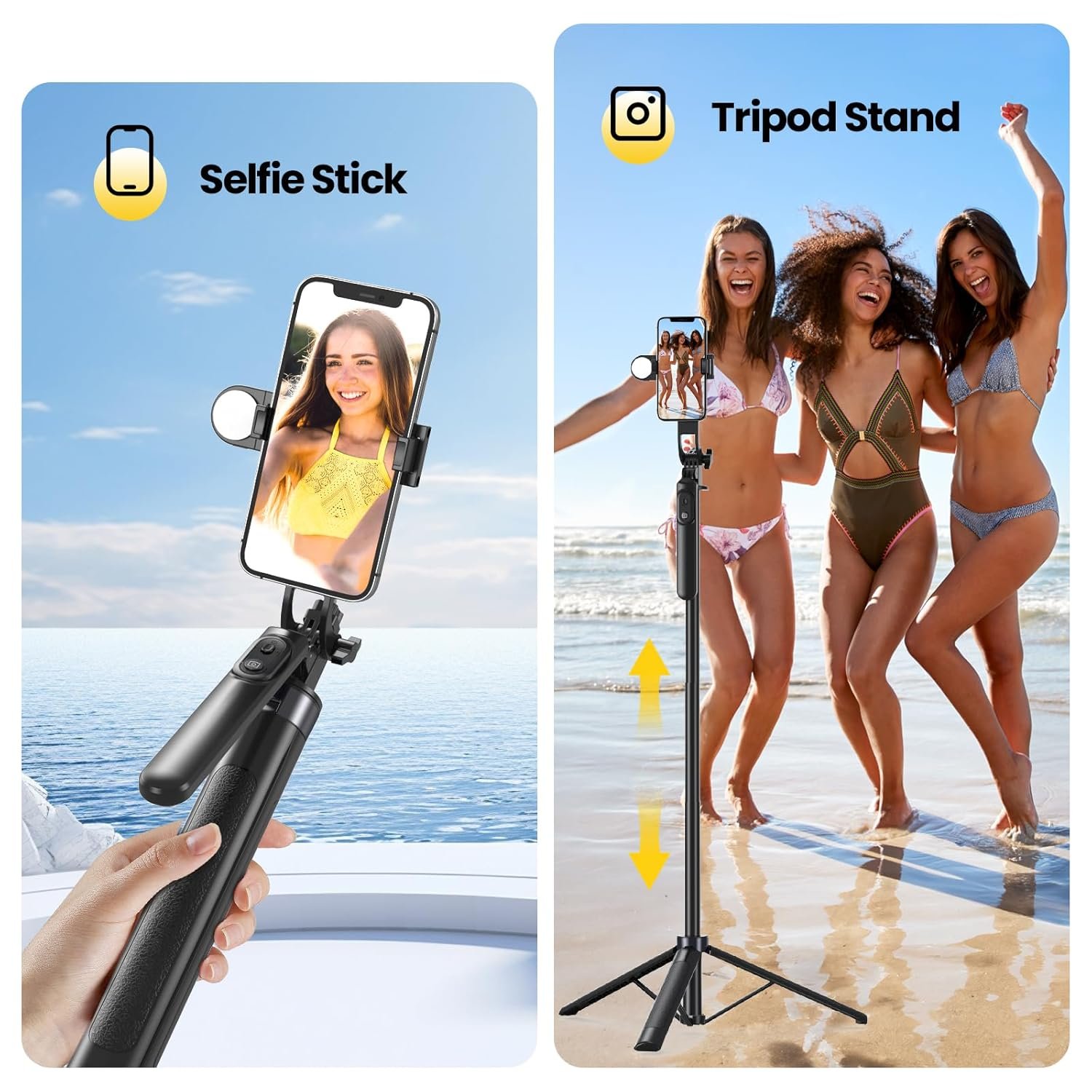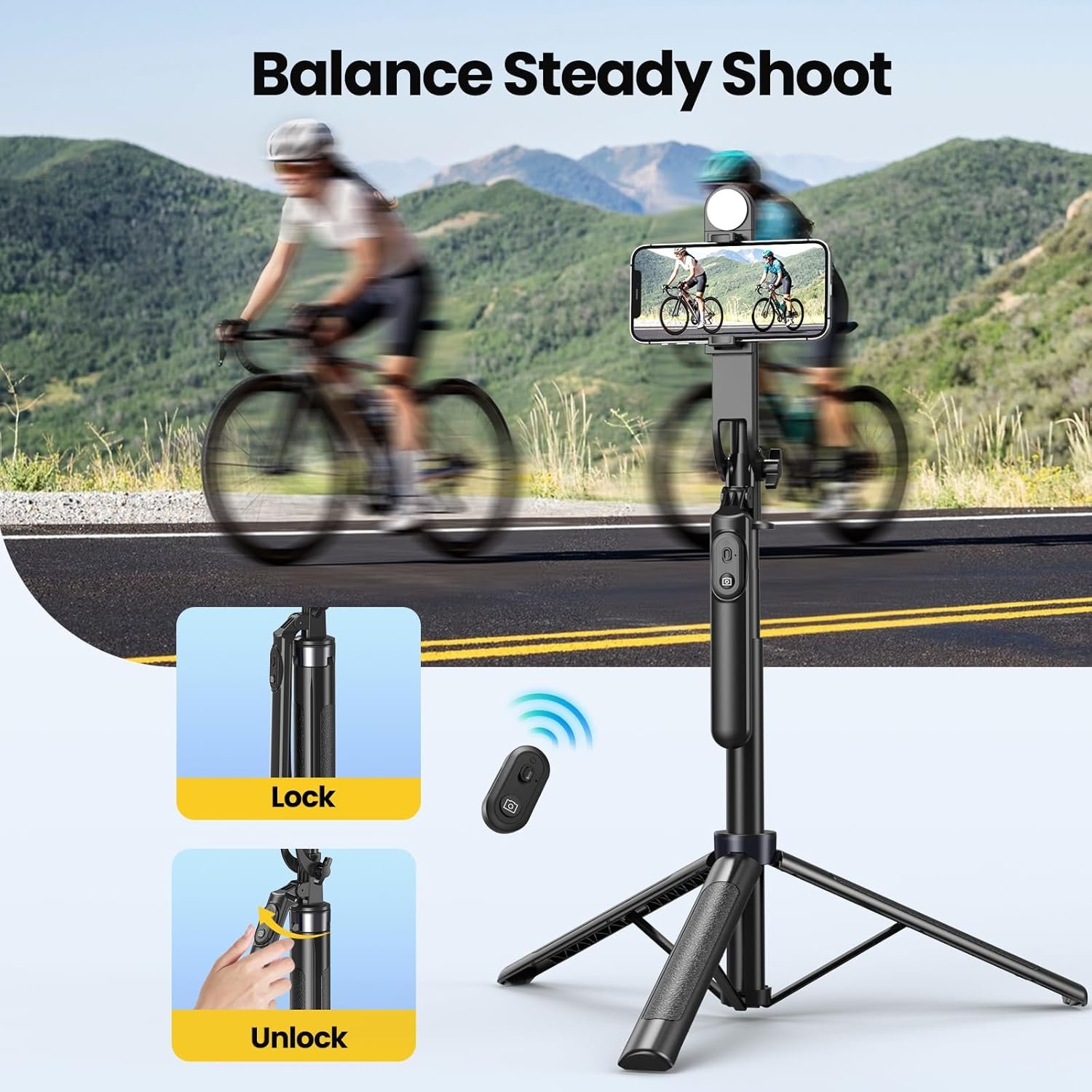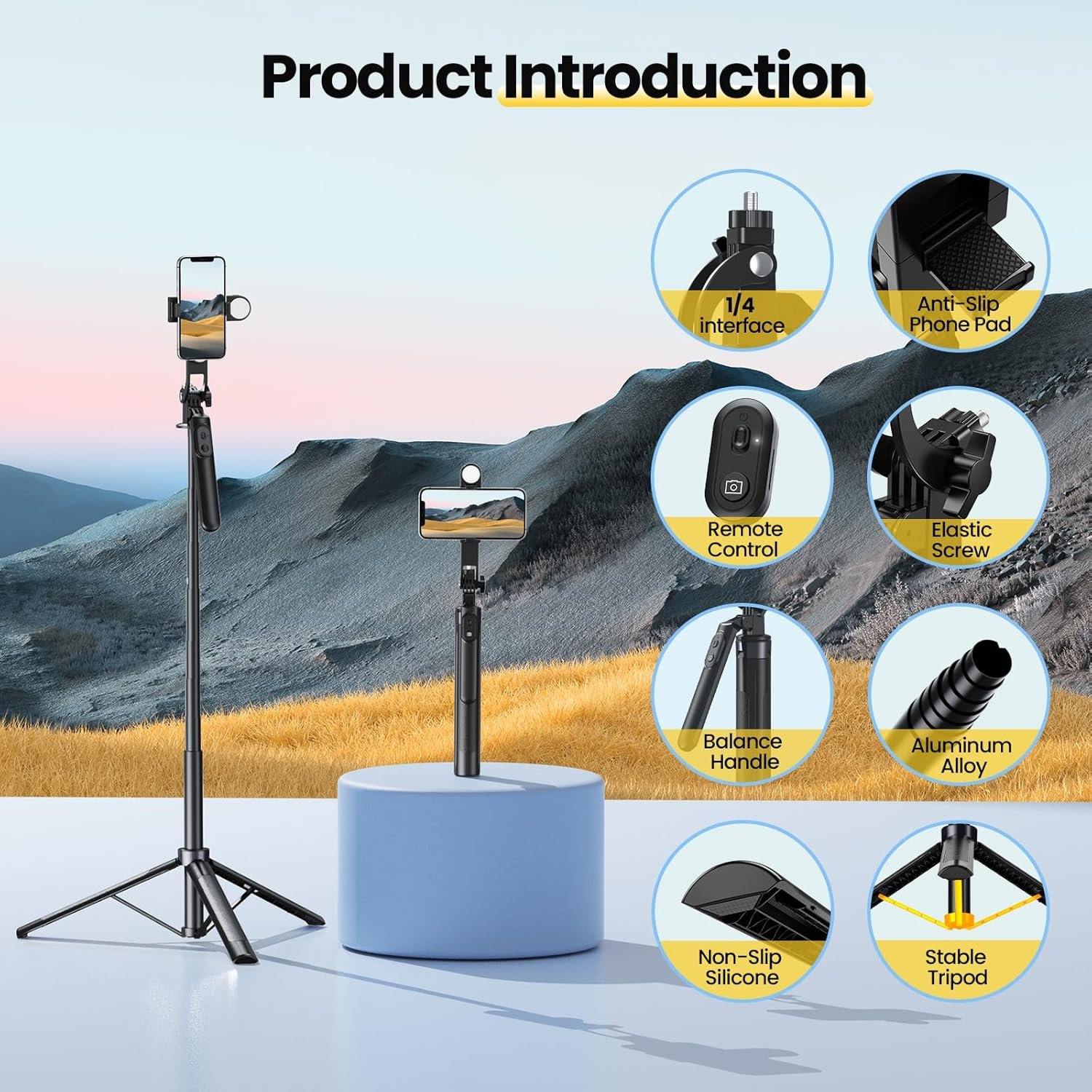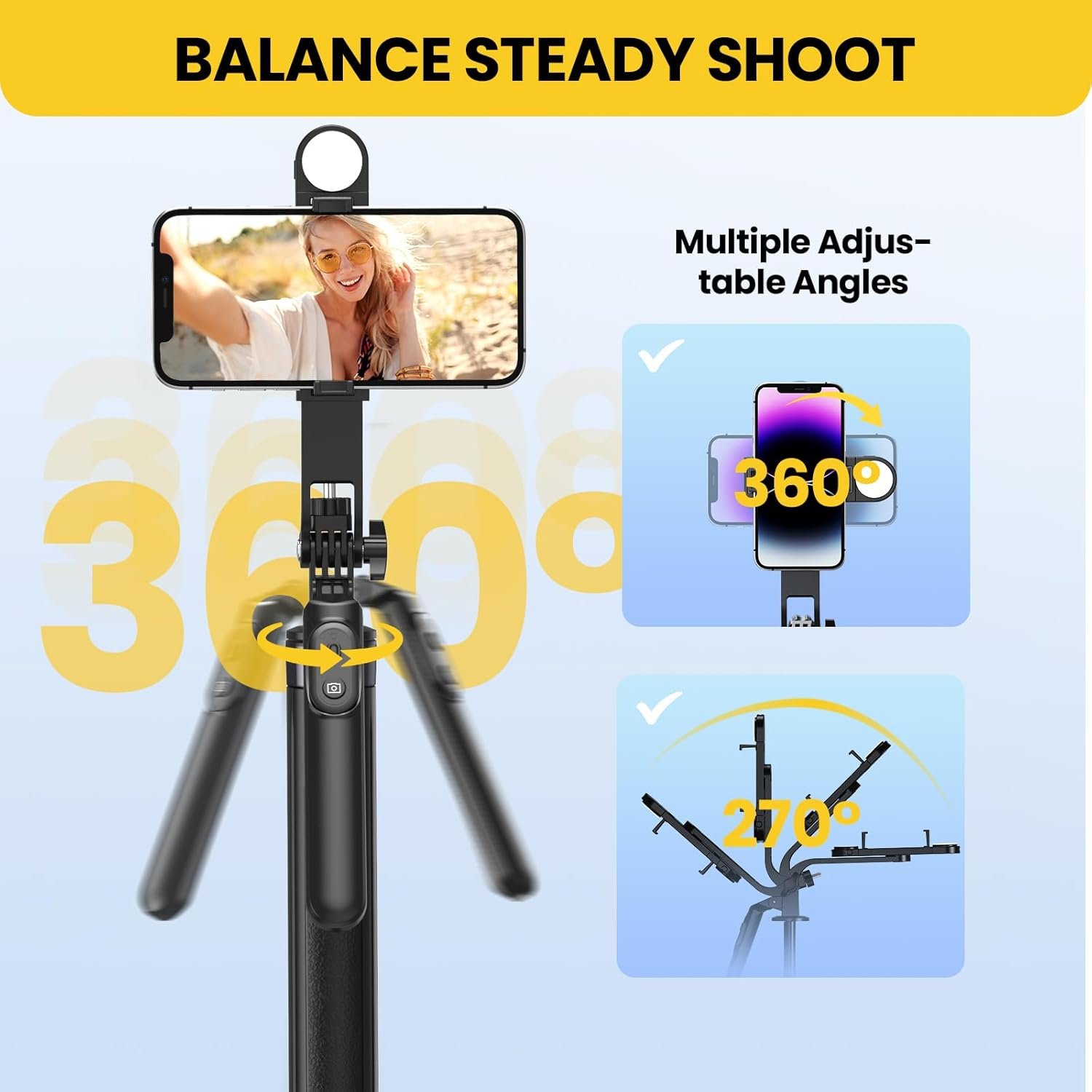 【360° Degree Rotation & Panoramic Shooting】Our Selfie Stick with Tripod Stand has an Additional Balance Handle. The handle can control the phoneholder allows 360° degree rotation, so you can rotate the handle to capture more of you want to shoot off