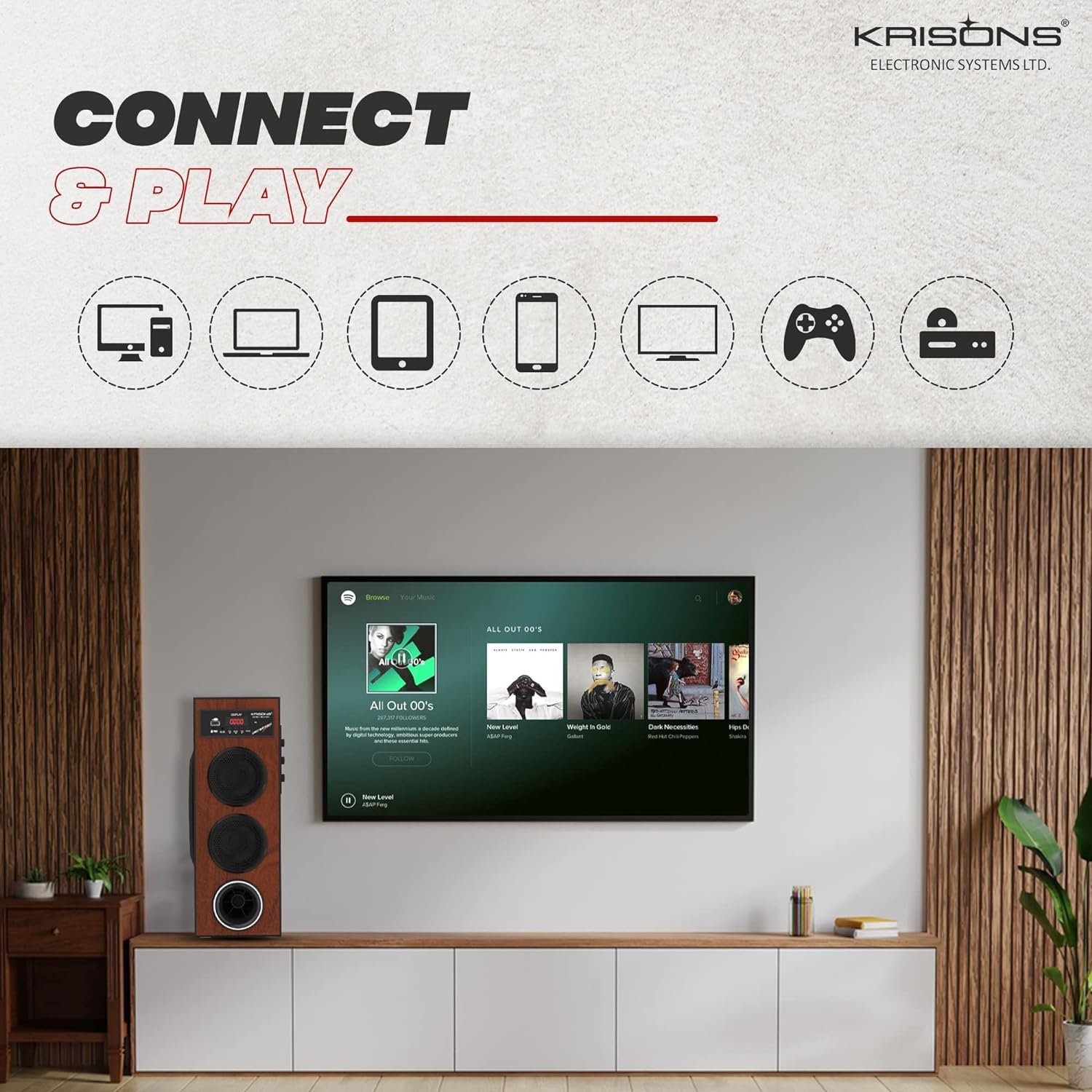 HIGH BASS 5000W P.M.P.O- Offers bold sonic output. Experience Full HD sound with punchy bass with its two powerful pairs of speakers