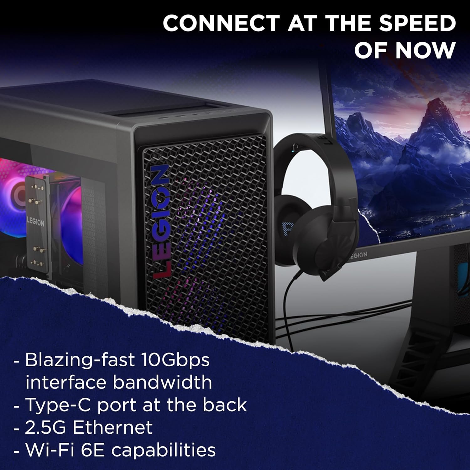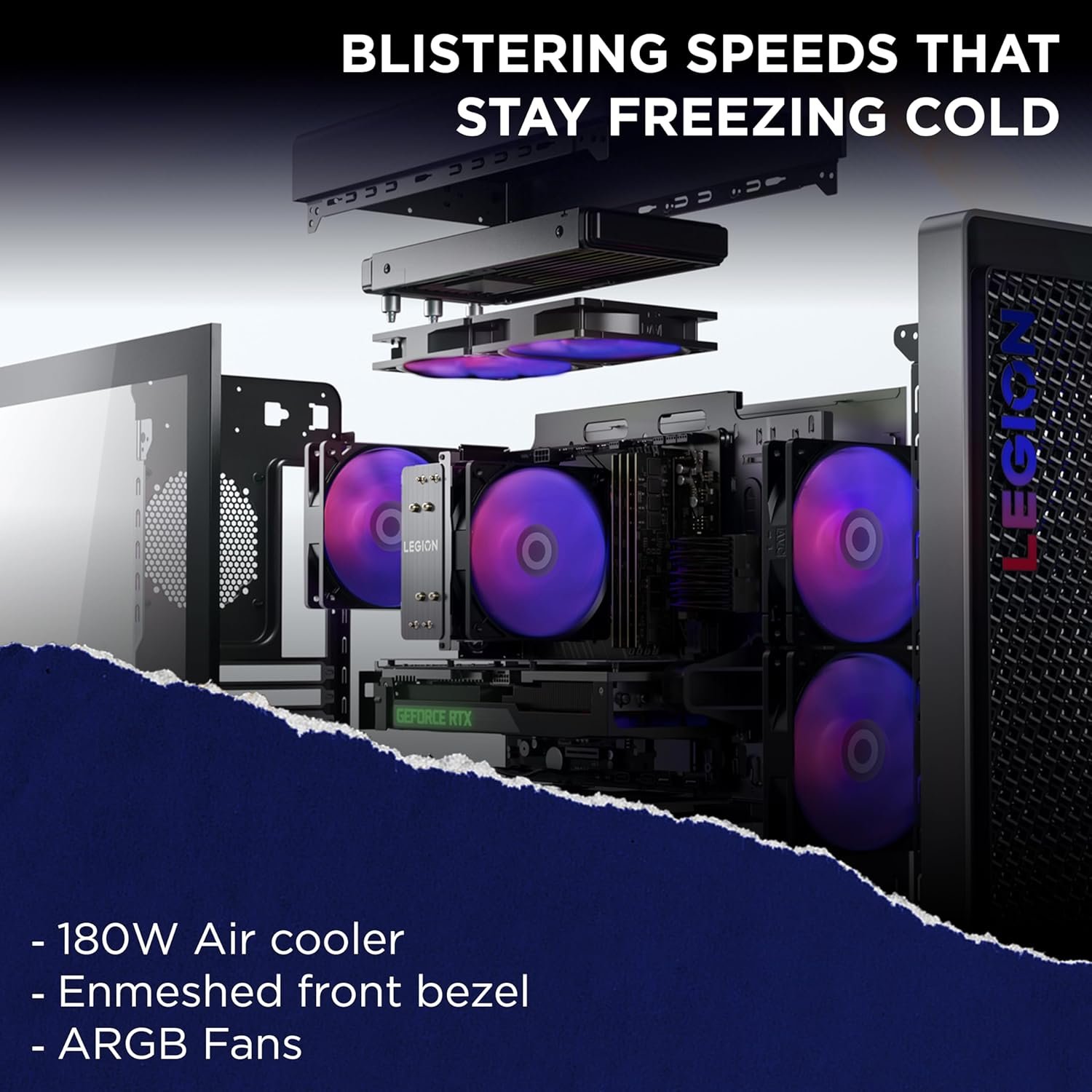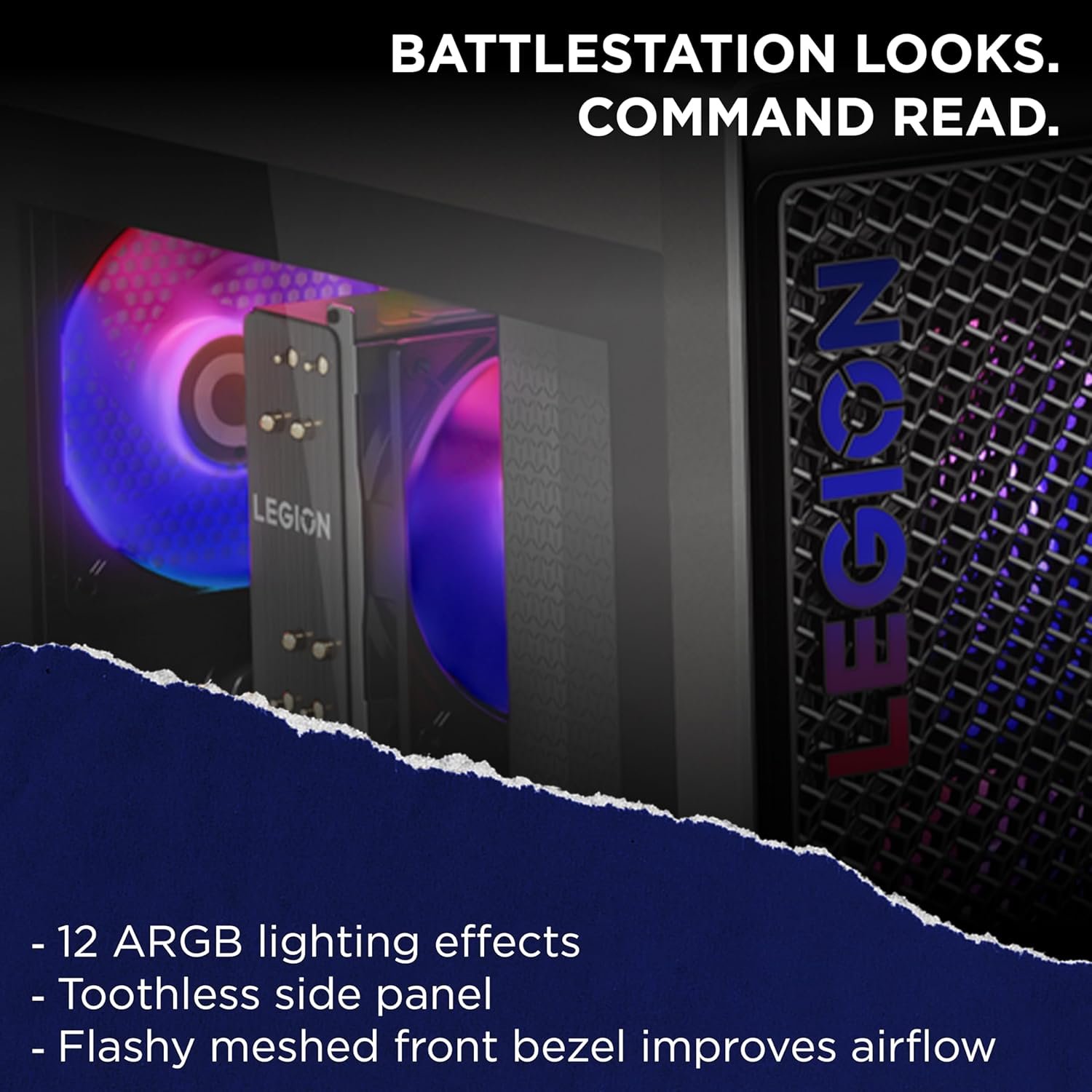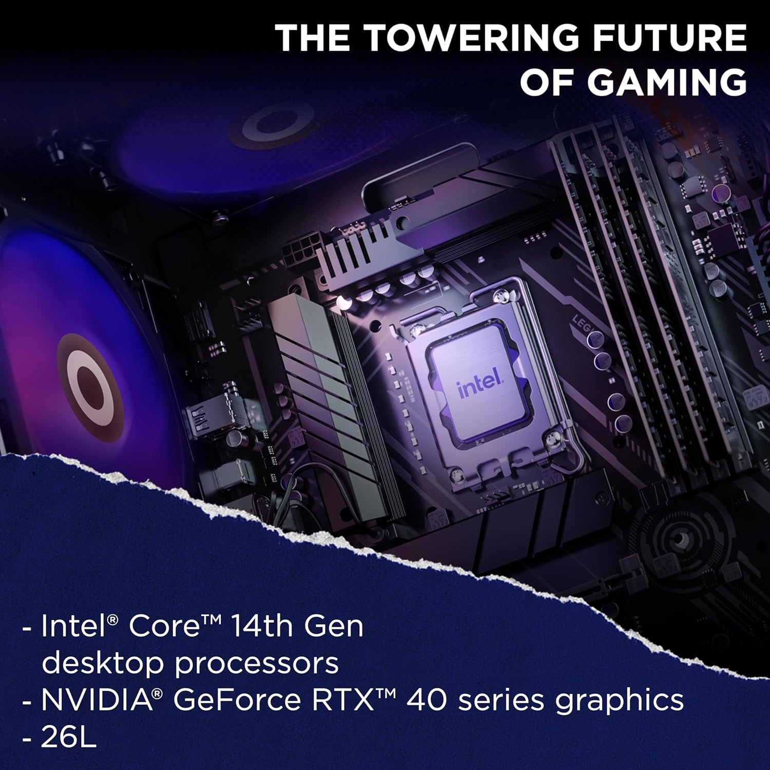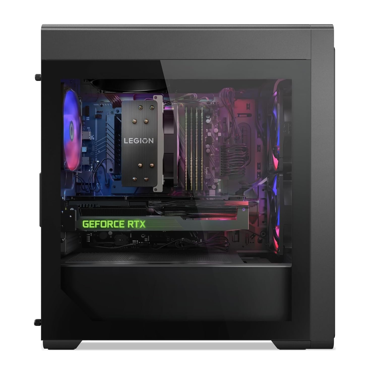 The gamer-inspired look and feel of the Legion Tower 5 begins with its robust and solid frame. It holds a hefty 26L Interior volume and sports an ample range of ports ? the building blocks of a true battle station. A blue LED logo illuminating the Phantom Black casing rounds out the stunning design, with transparent side panels and internal ARGB lighting to showcase your rig for all to see.