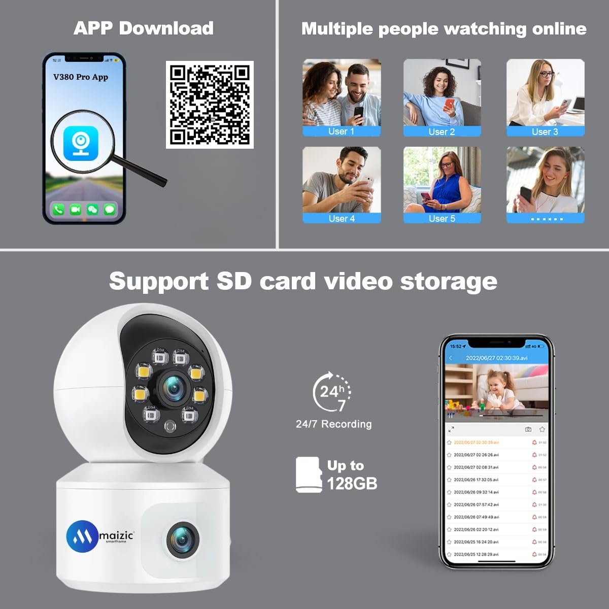 #[SD Storage up to 128GB]: Supports SD cards for storing extensive video footage, offering a cost-effective alternative to cloud storage.