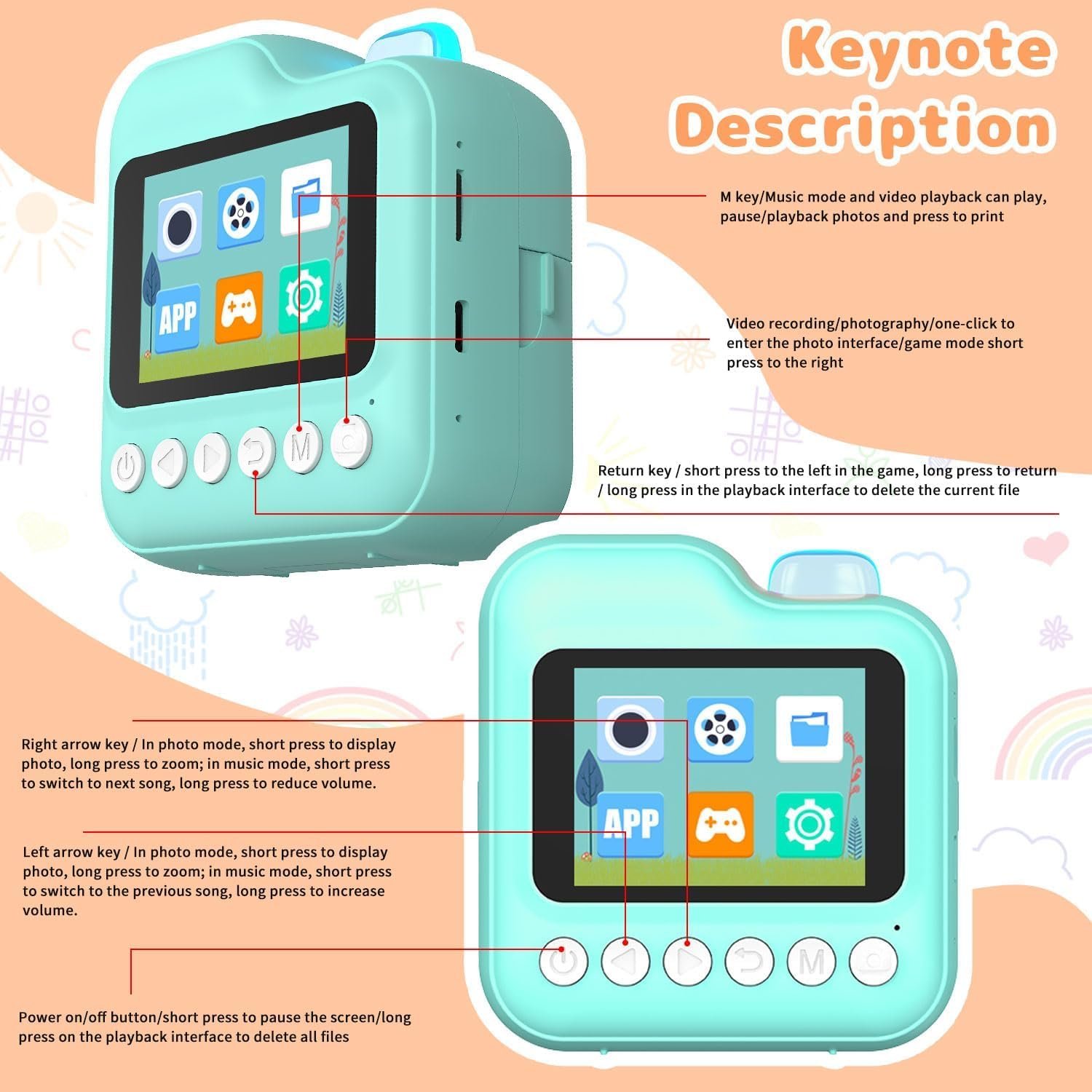 š·ćMultifunctional Kids Digital CameraćMANVI mini camera has instant printing, 2.0-inch large screen, 1080P video, 4X digital zoom, flash, time-lapse photography, continuous shooting, games, filter frames, mp3. Photography, painting, music, video, and games are children’s favorite entertainment, and cameras with these functions can stimulate children’s desire and interest in photography.