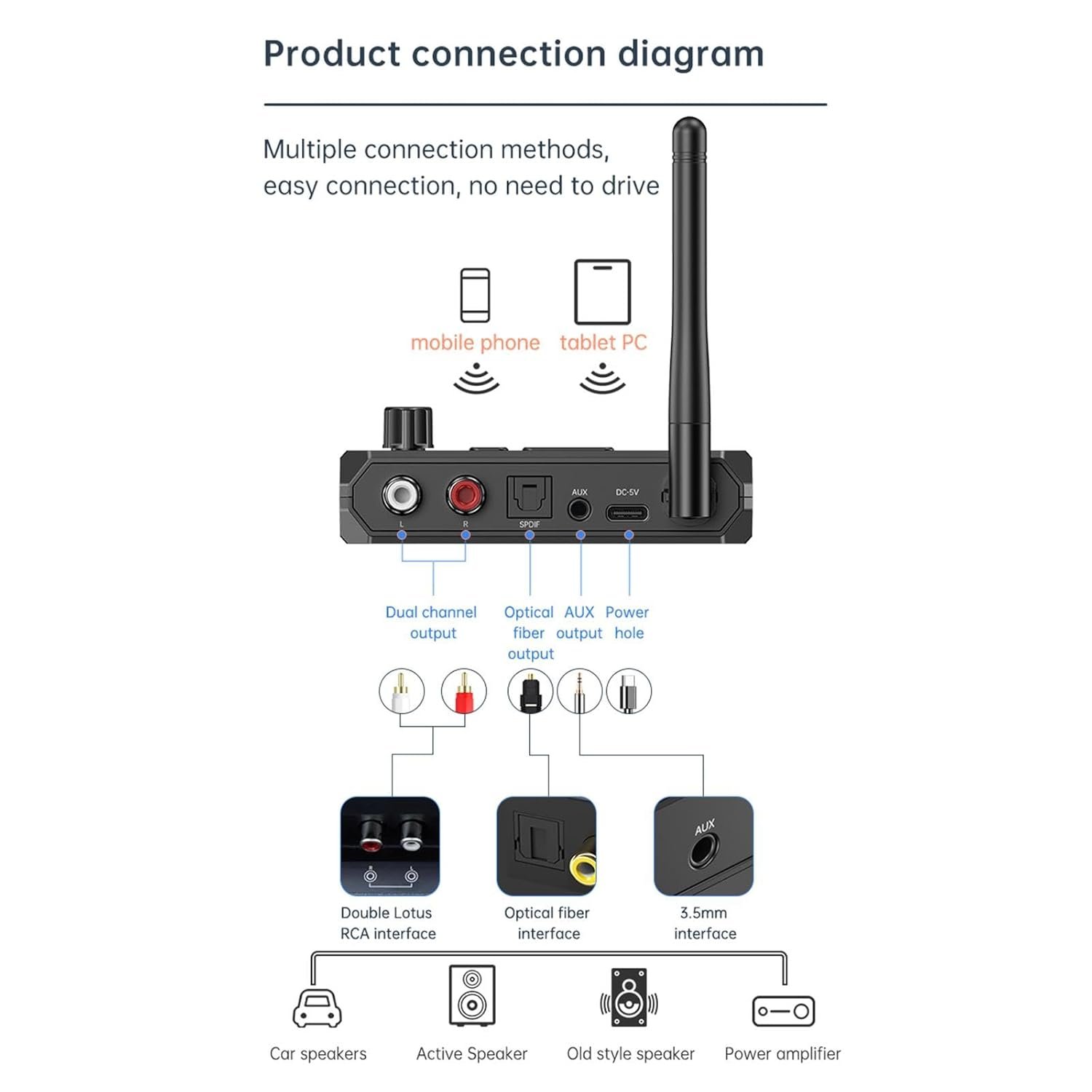 Audio Receiver and Transmitter Audio Adapter with rich interfaces like 3.5mm AUX , RCA right and left, optical fiber , versatile design to meet the needs of different devices