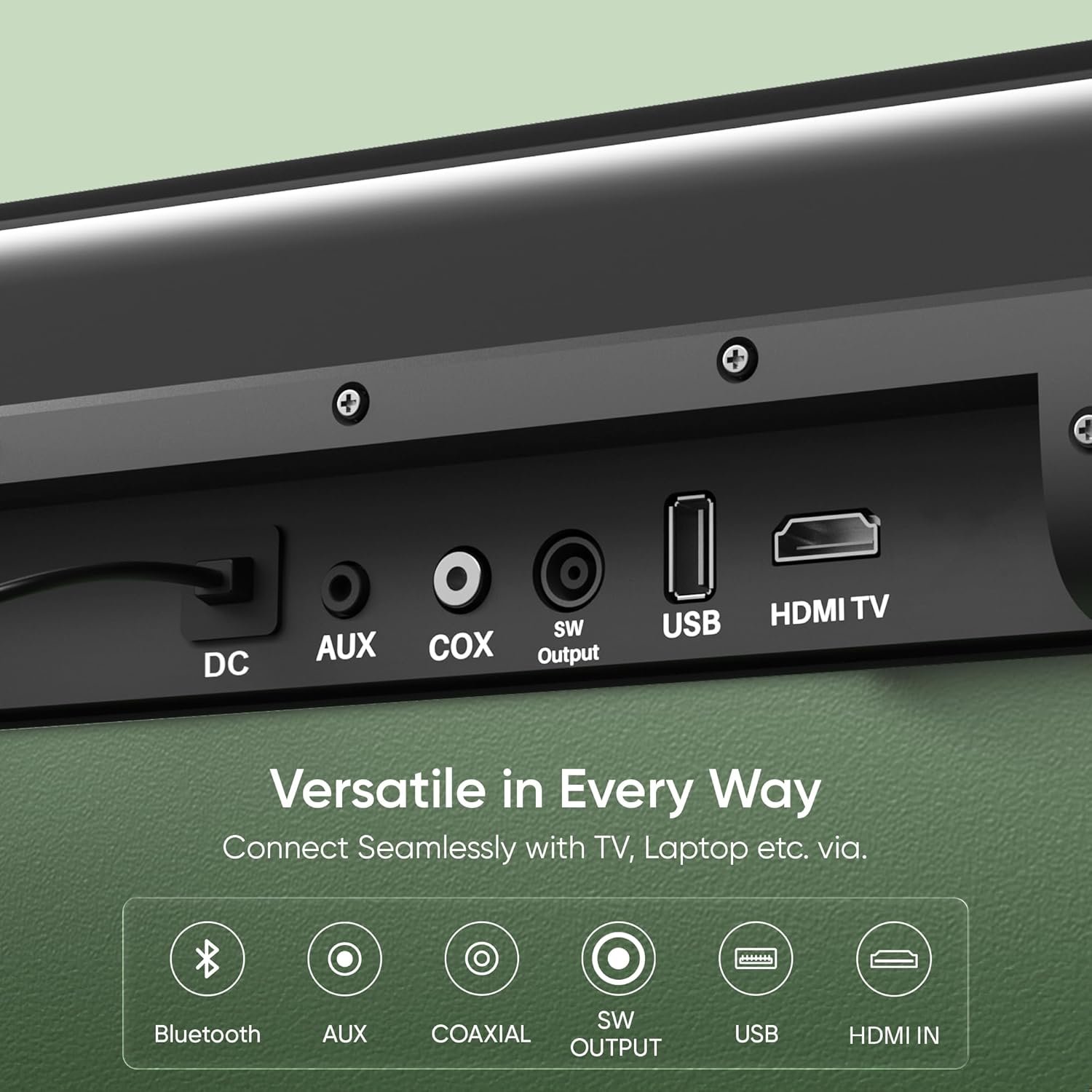 Versatility: Connect the soundbar with TV, laptop, etc. seamlessly via input modes. The soundbar gives 4 unique options to choose from including, USB, AUX, Coaxial and HDMI (ARC) along with Bluetooth v5.3