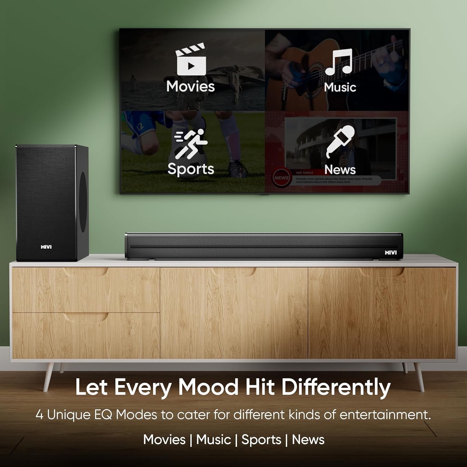 Entertainment: The Multiple EQ Modes offers a unique audio experience based on your preference among Movies, Music, Sports or News on a simple tap on remote.