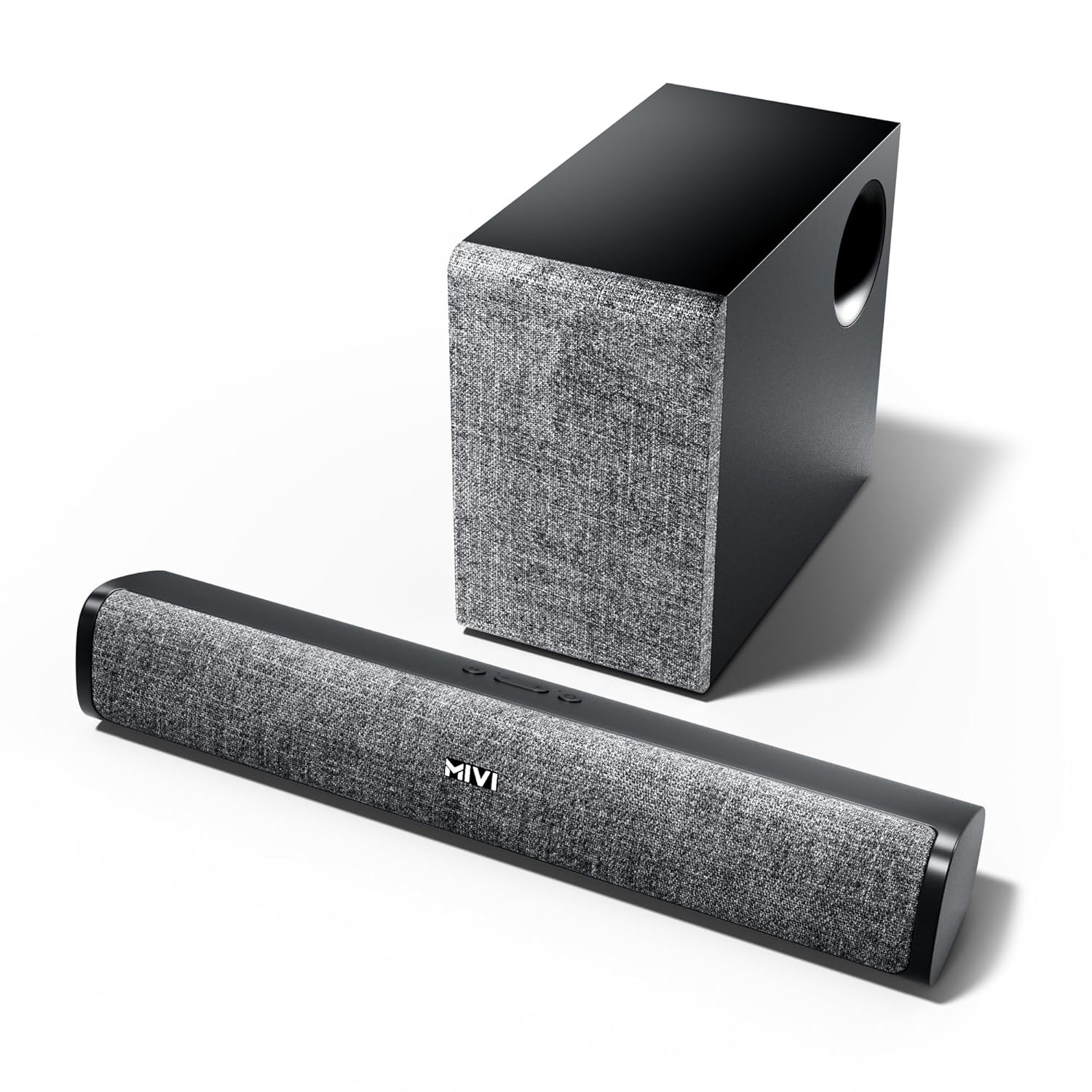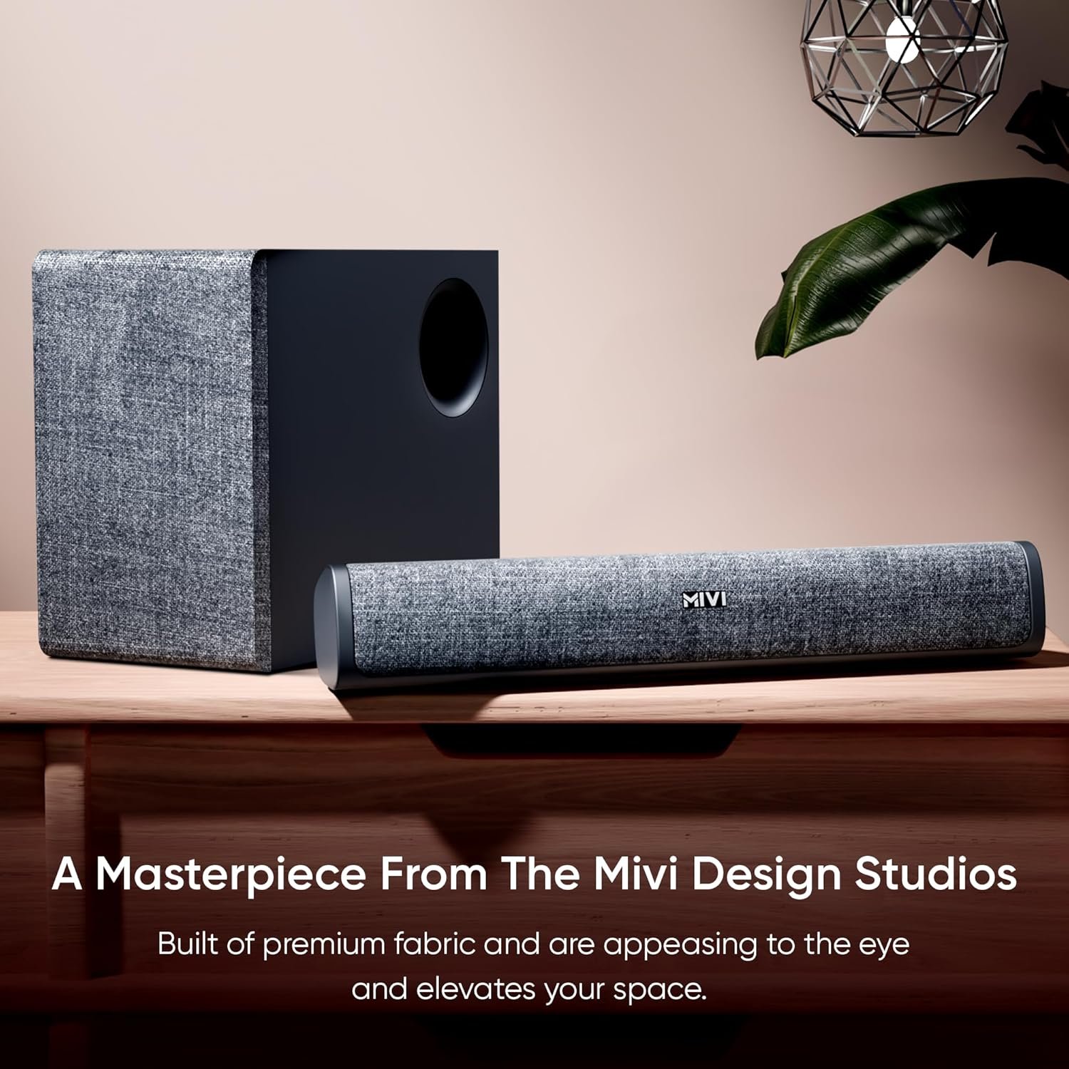Iconic Design: The soundbar cabinet and the external subwoofer are crafted in a pristine Matt-finish casing blending seamlessly with the front panel draped in premium fabric.