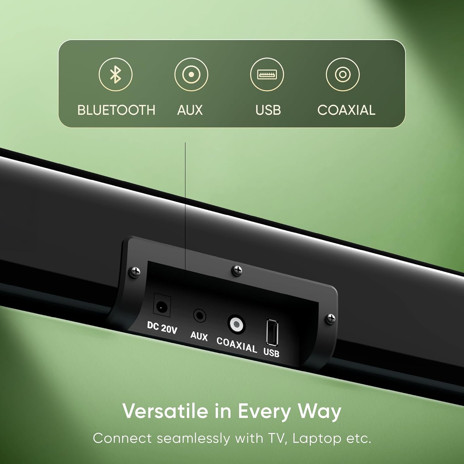 Versatility: Connect the soundbar with TV, laptop, etc. seamlessly via input modes. The soundbar is decked up with 3 unique options to choose from including, USB, AUX and Coaxial along with Bluetooth v5.1