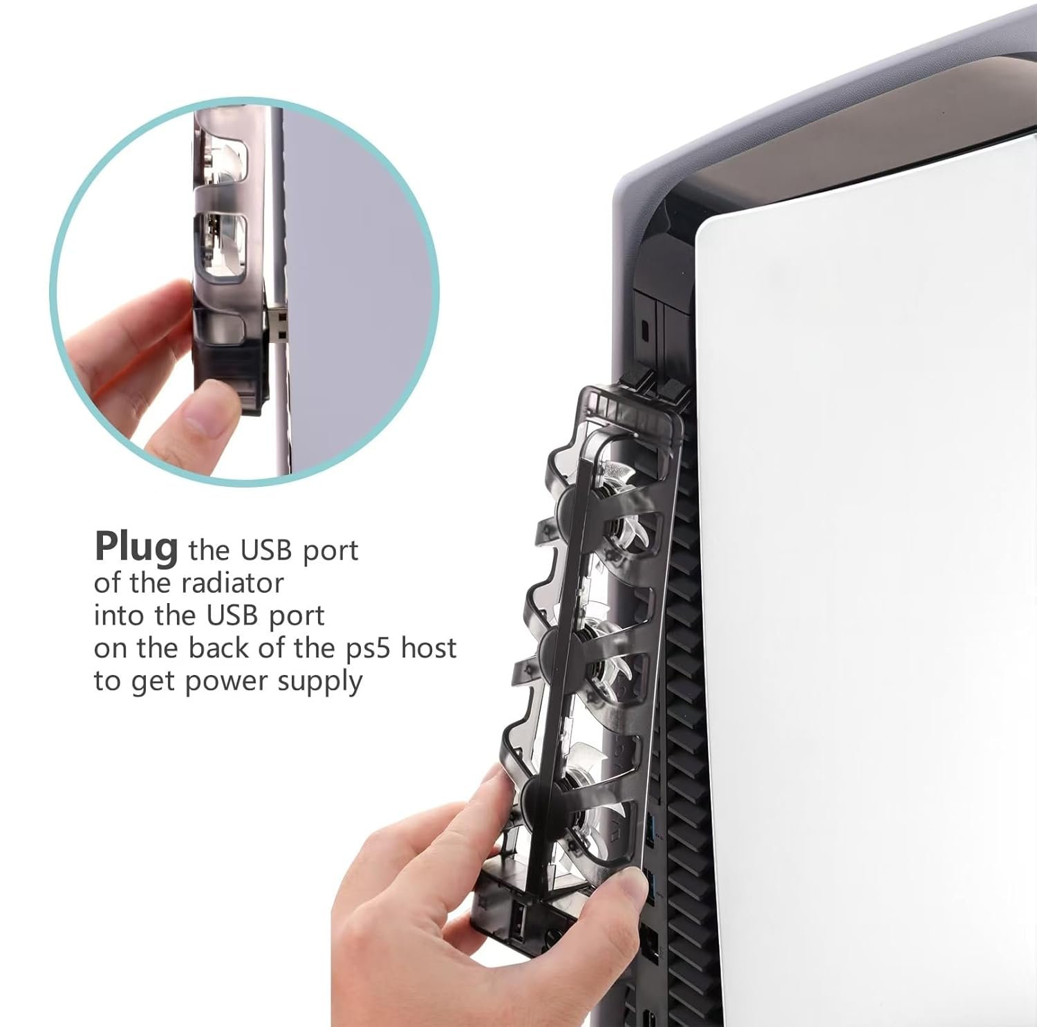 3. USB Output Port: The USB male connector is pluged to the USB port on the back of the PS5 console. And the USB output port on the cooling fan can supply DC5V