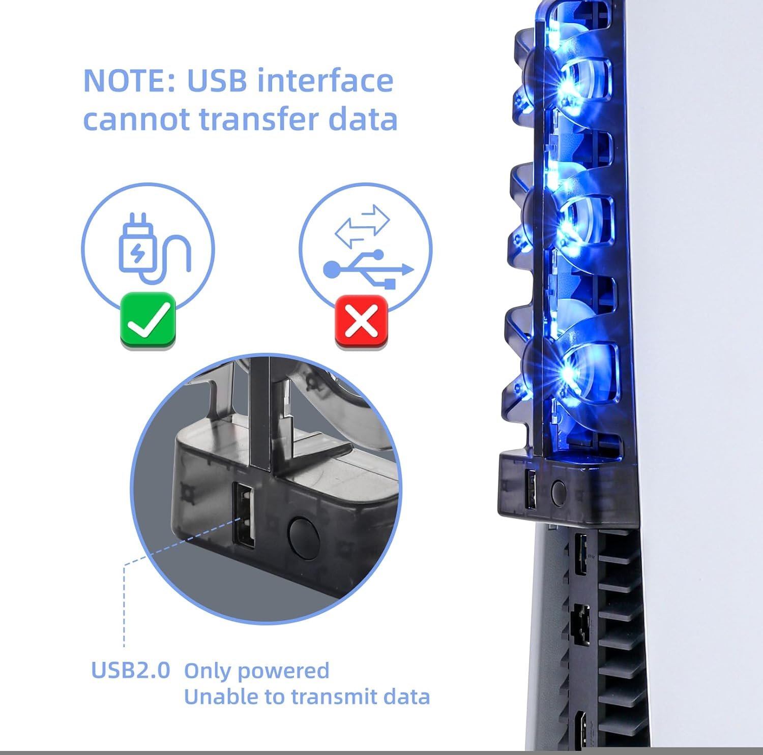 This product is a new type of intelligent multifunctional cooling fan, which can dissipate heat for the PS5 console, and it also has a USB output port(Can not support transferring data). You don’t need to buy another power supply. It has practical functions and is convenient to use.