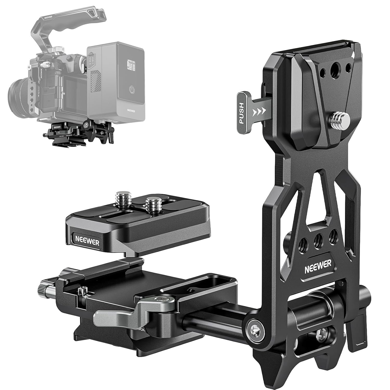 【180° Flexible Battery Positions】 The 180° tilting battery plate lets you mount the V mount battery in vertical or horizontal positions and makes sure the camera’s flip screen will be fully articulated. Fold it flat and fit it inside your gear bag when you set out for outdoor shooting tasks