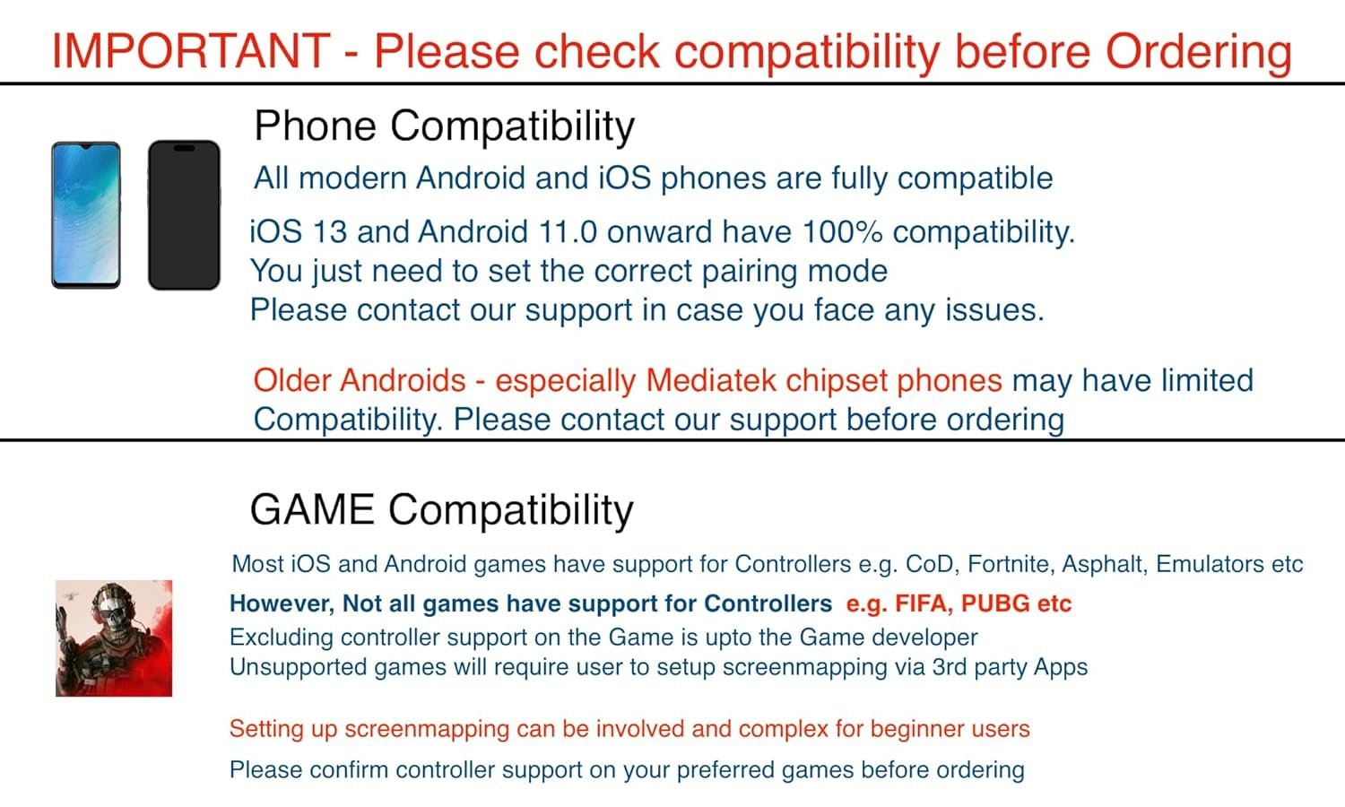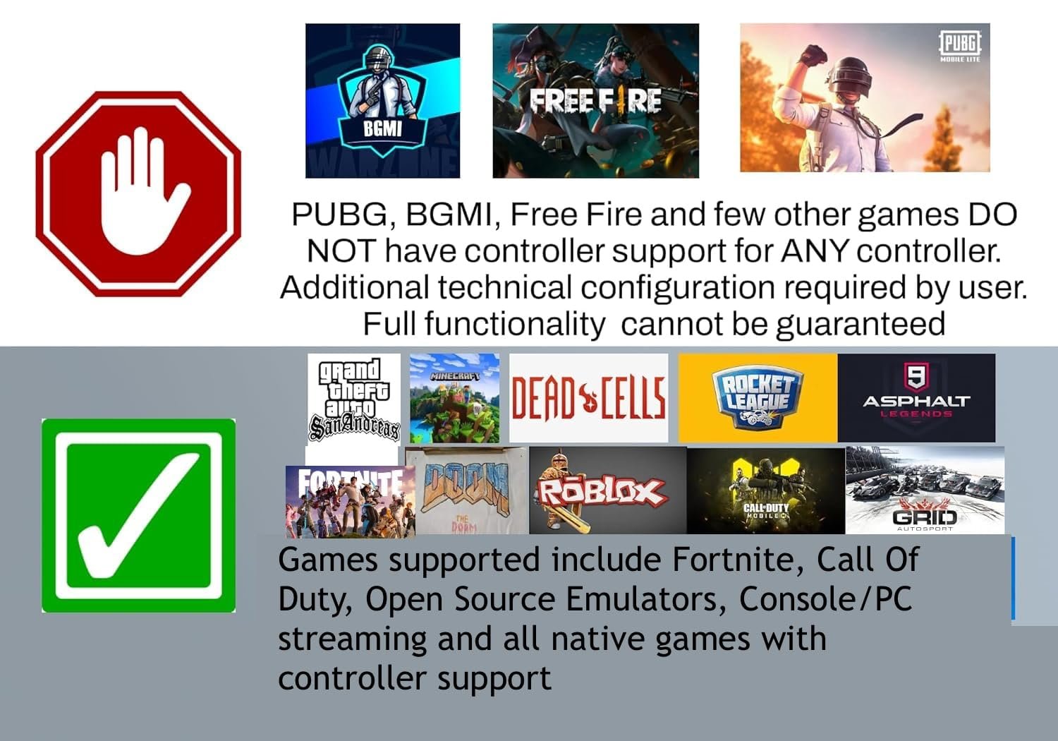 Games with NO controller Support ( BGMI/ PUBG / Free Fire etc ): NO CONTROLLER (incl this) WORK NATIVELY with BGMI, Free Fire, PUBG – User needs to use a compatible screenmapping app. Compatibility with these games is not guaranteed. Please research before ordering