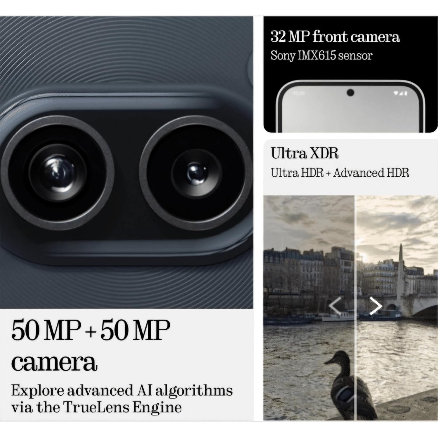 ☆【Camera】:- 50MP (OIS) + 50MP | 32MP Front Camera || Dual Camera Setup: 50MP Main Camera (Samsung GN9, f/1.88 Aperture, 1/1.56 inch Sensor Size, OIS & EIS, Auto Focus) + 50MP Ultra Wide Camera (Samsung JN1, f/2.2 Aperture, 1/2.76 inch Sensor Size, FOV: 114 Degree, Fixed Focus) || Front Camera Setup: 32MP (Sony IMX615 Sensor, f/2.45 Aperture, 1/2.74 inch Sensor Size, Camera Features: Advanced HDR, Motion Photo, Lenticular (Filter), Night Mode, Portrait Mode)