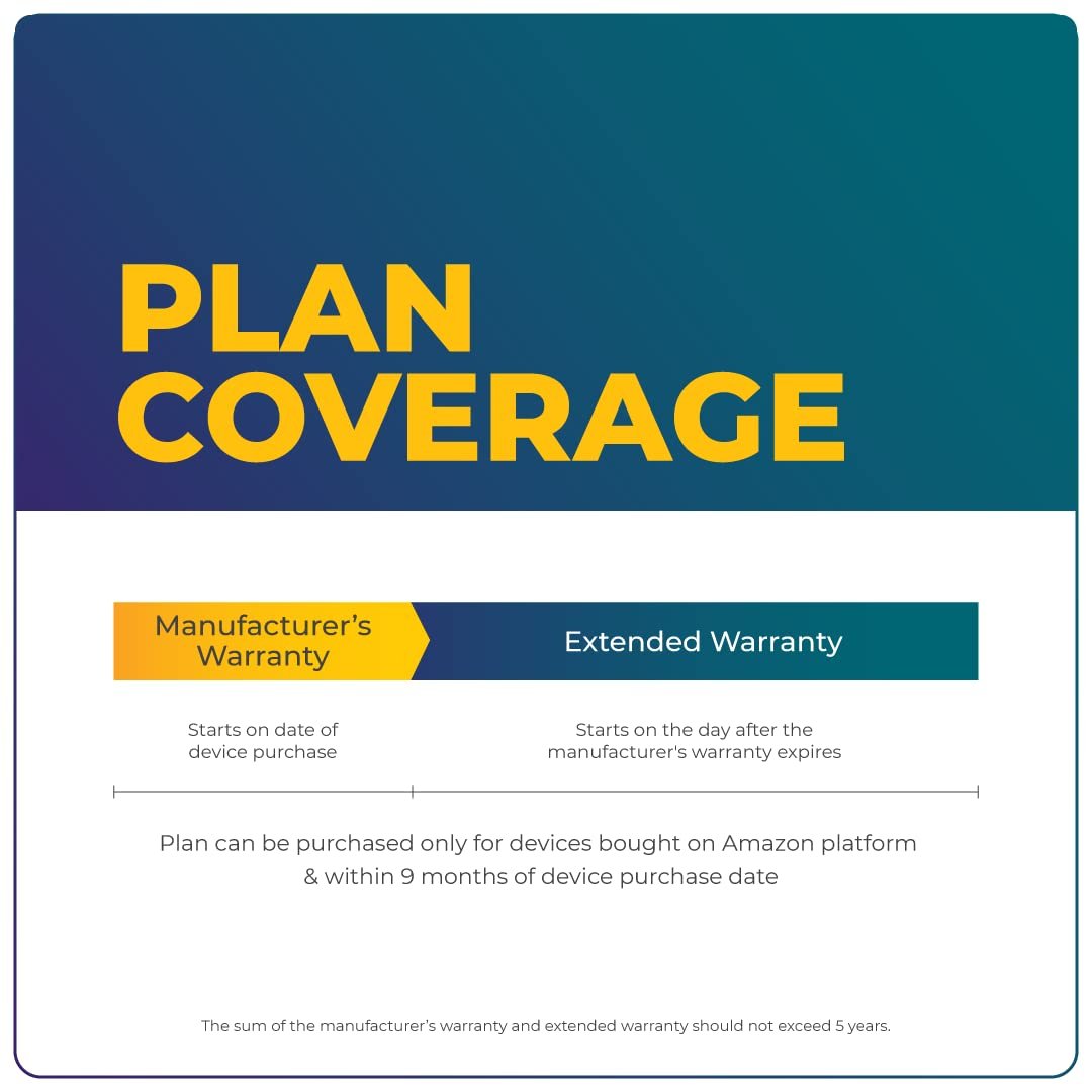 ELIGIBILITY: The plan can be purchased only for new devices bought on the Amazon platform and WITHIN 9 MONTHS of device purchase. You can purchase this plan only for devices which have AT LEAST 1-YEAR manufacturer’s warranty valid in India. The sum of manufacturer’s warranty and extended warranty CANNOT EXCEED 5 YEARS. This plan does not cover products or devices purchased or used for COMMERCIAL purposes.