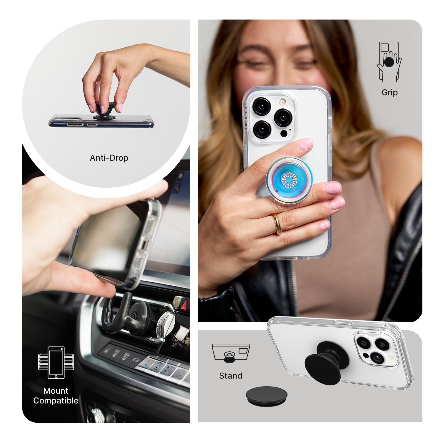 Our durable PopSockets for iPhone, Samsung and any other devices, we call a “PopGrip” is anti-drop, allows for one-handed use of your device, and the ability to prop up your phone wherever you go