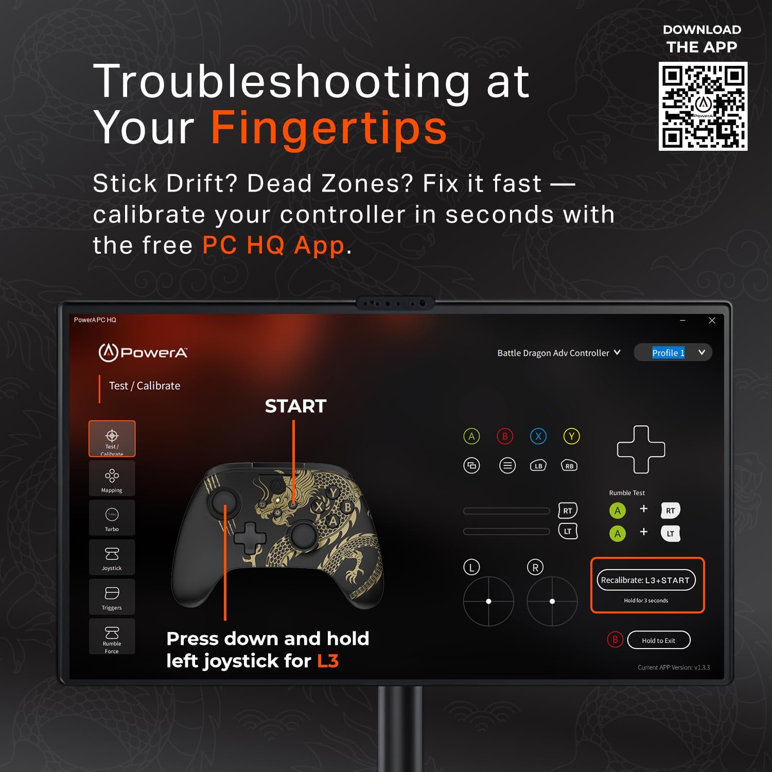 App Support – Test, calibrate and customize your controller with the free PowerA Battle Dragon App. Download the app by scanning the QR code displayed in the product image. App supports wired USB-C and 2.4GHz Wireless only; Two-Year Limited Warranty