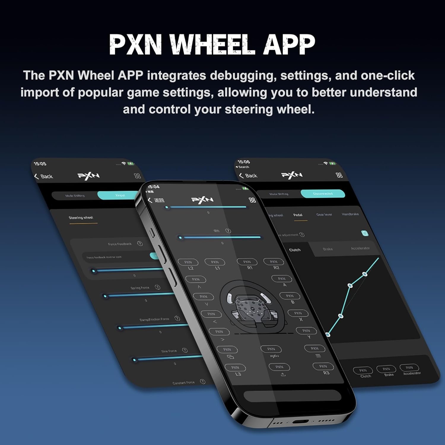 [ Dedicated App ]Streamline your PXN Wheel setup with our dedicated app. Quickly import settings, adjust steering angle, and optimize force feedback. Customize button mappings, preset keys, and test buttons. Download the “PXN V Series” app on your mobile for seamless integration. With user-friendly features, enhance your gaming experience and get the most out of your PXN Wheel.