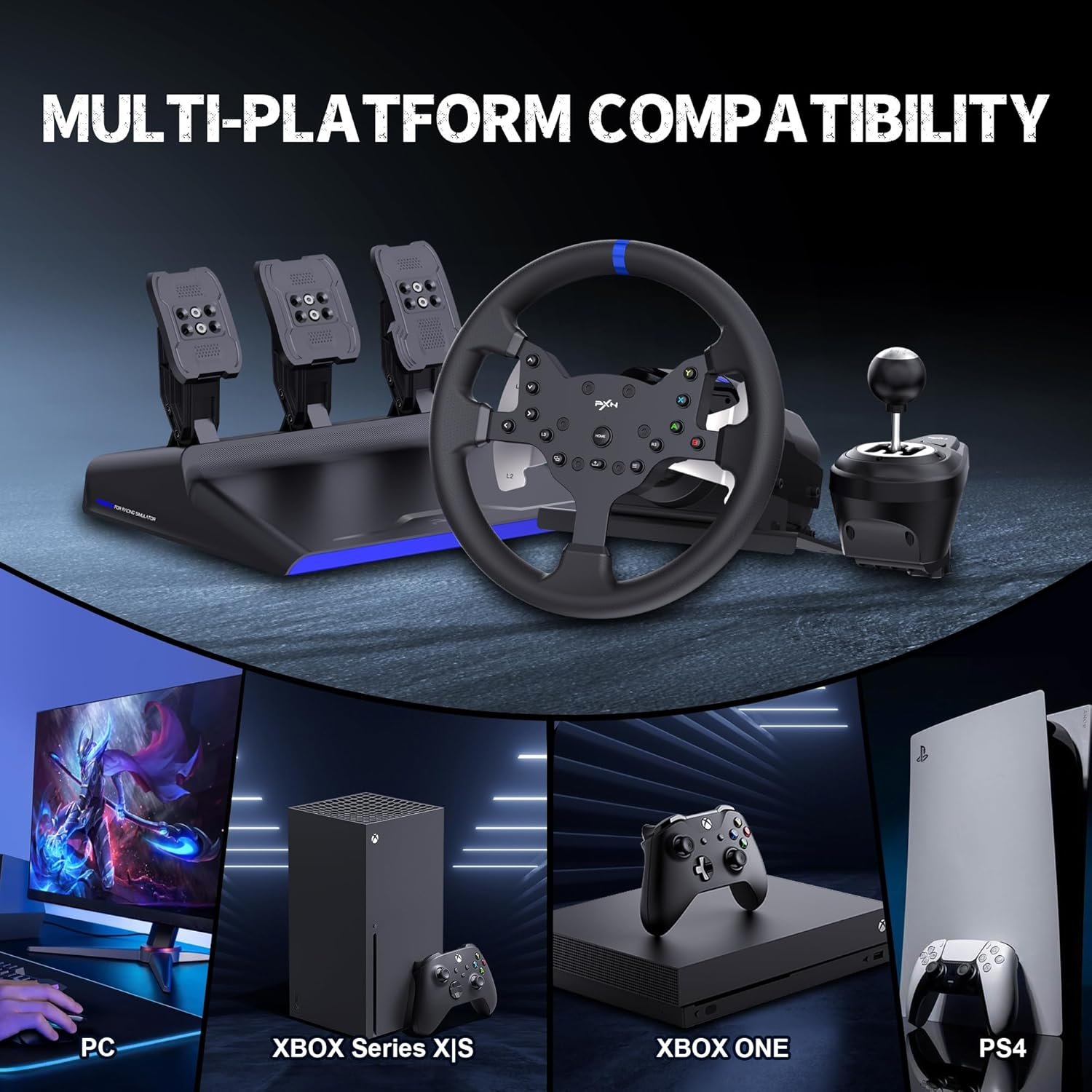 [ Multi-platform compatibility ]: PXN-V99 force feedback gaming steering wheel, compatible with PS4 , PC, Xbox one/Xbox series ,compatible with Windows 7 / 8/10/11 operating system.Connet to game console by USB .