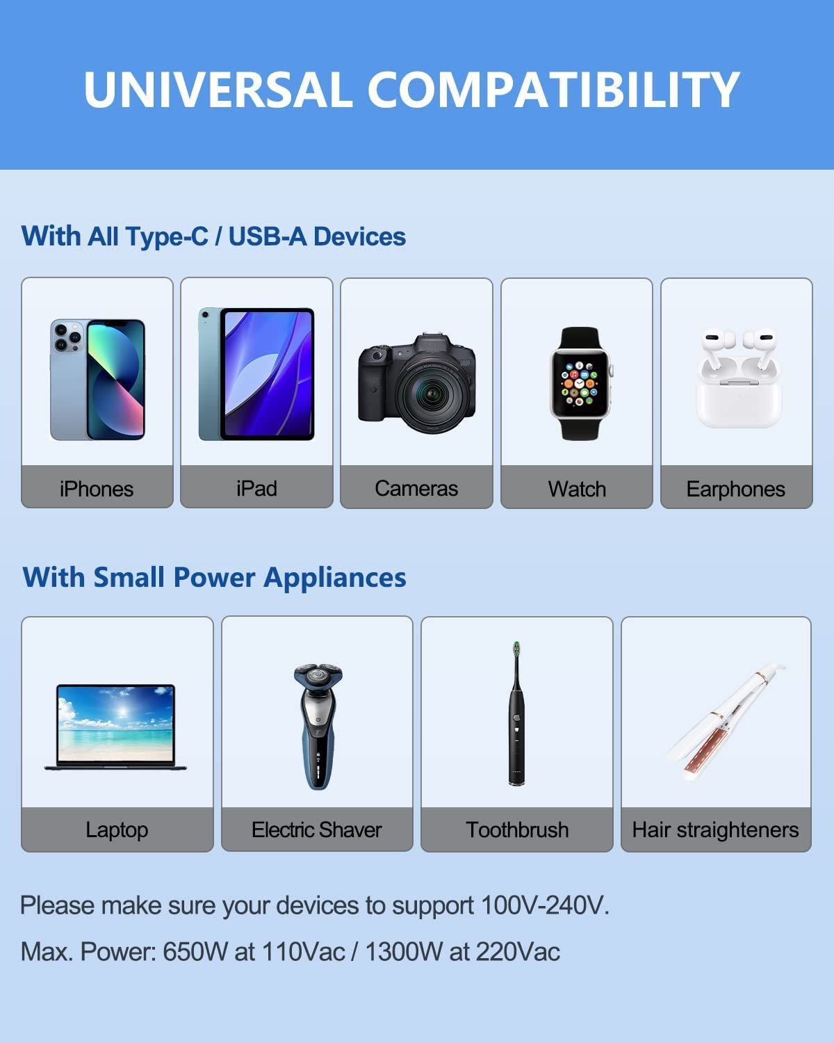 🌐 【Power Range】- Rating: 100-250V~6A Max. Max: 250V~6A/1500W 100V~6A/600W. Warm Tips: Appliances (AC Devices) with a power exceeding the adapter’s maximum power are NOT allowed to use this travel plug adapter.