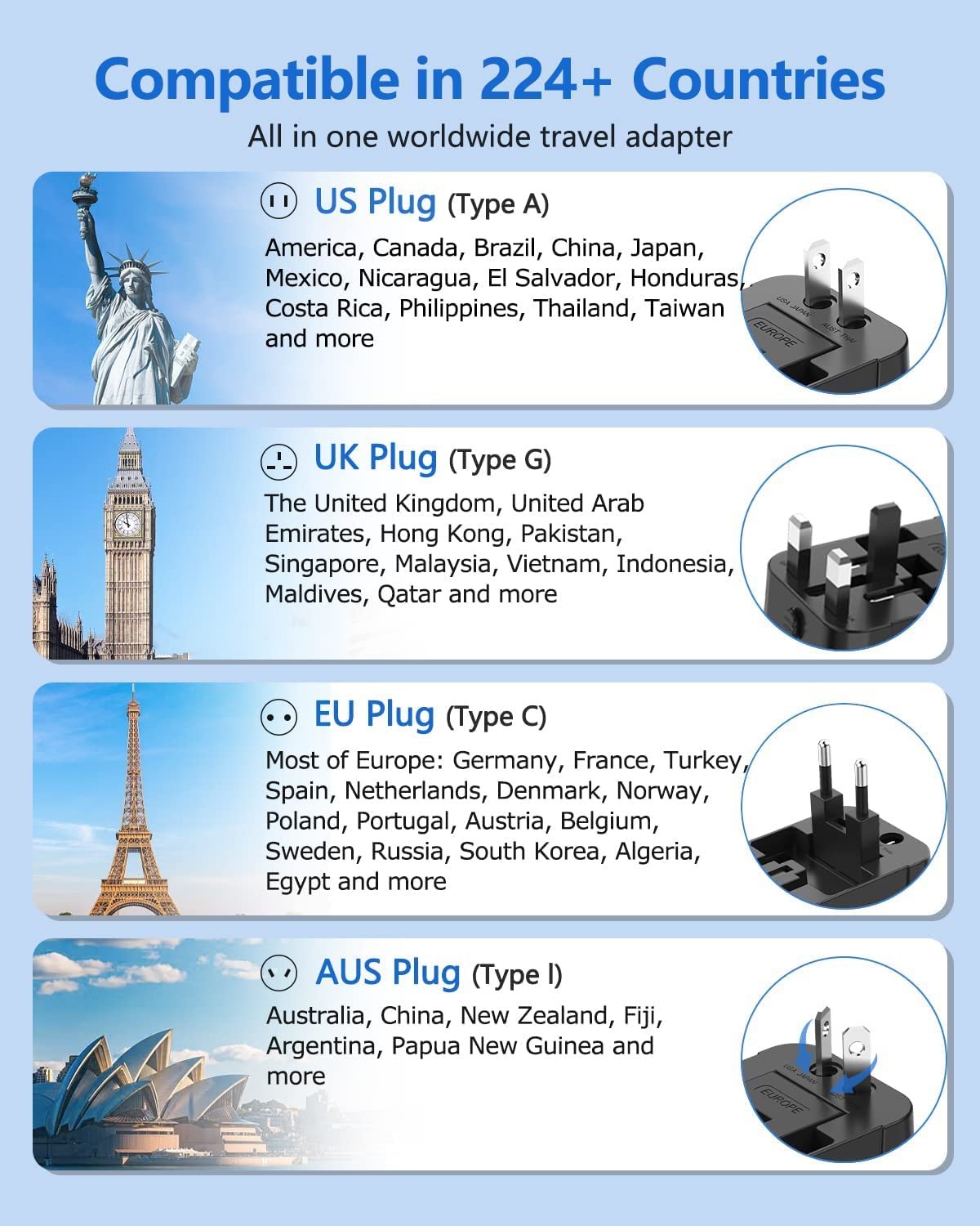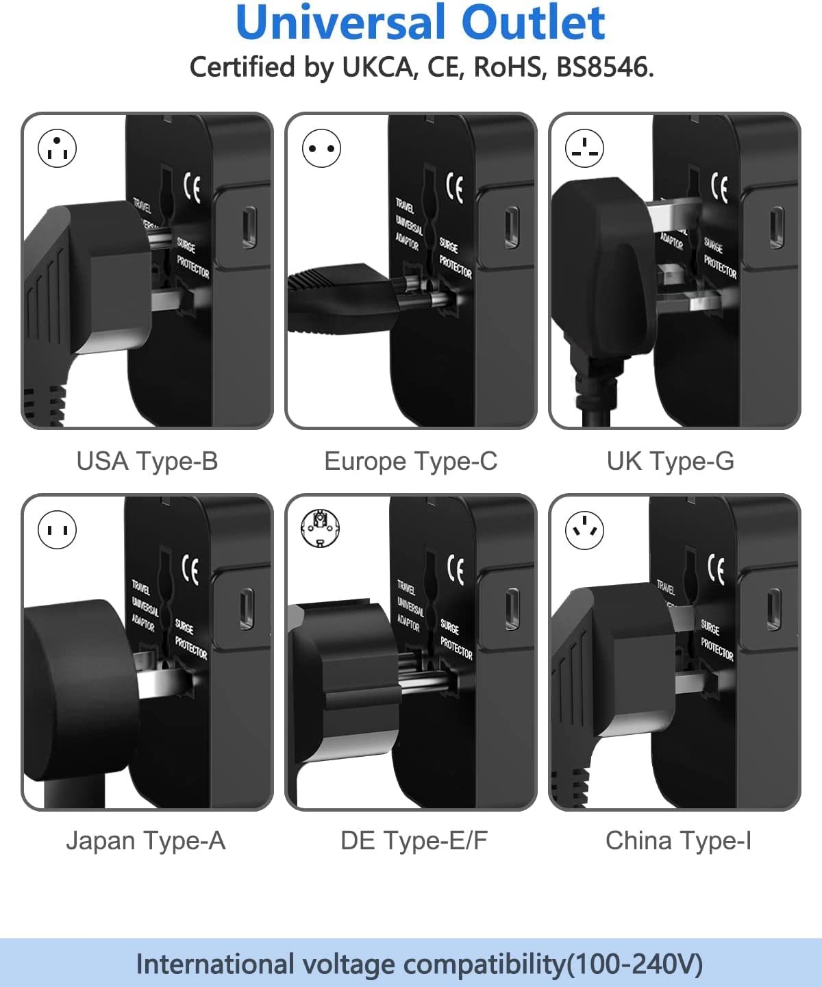 🌐 【Safety Certified】– This international travel adapter is built in Max 6A Fuse to protect your gadgets from power surges. Different from other same products, it also has safety shutters and a plug lock system, certified by RoHS, CE, and FCC, ensuring its safety and reliability to the greatest extent.