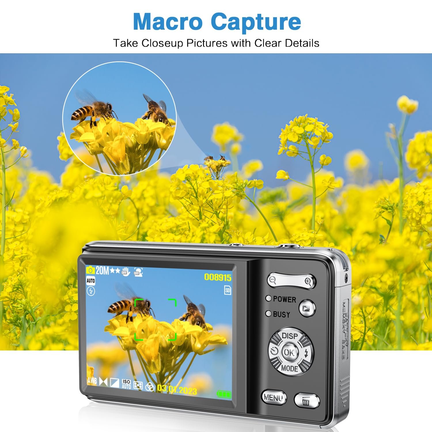 【4K Macro Camera】: This 4K camera has macro function, which can magnify nearby subject for close-up photos. You can take pictures of flowers, insects, small objects in close-up photography with this small camera. It also has pause function that you can pause the recording and continue from where you stopped without starting a new file, it is easier to edit the videos.