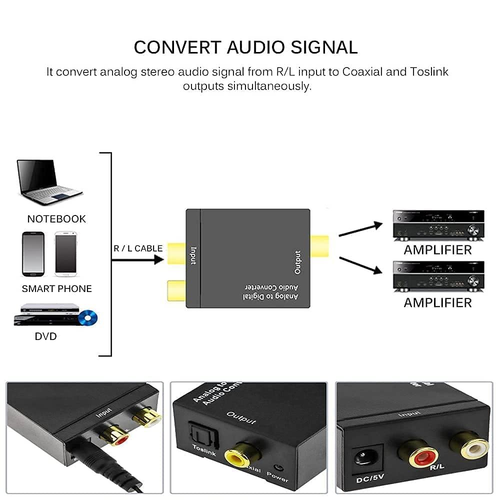 ★ This high quality ADC (Analog to Digital Converter) is designed for converting from stereo L/R input to Coaxial S/PDIF and Toslink Optical outputs simultaneously. A great ADC unit for converting from analog audio devices like DVD player, Pod/MP3, computer to digital audio for audio receiver, amplifier, home theater system, speaker and other receiving devices.