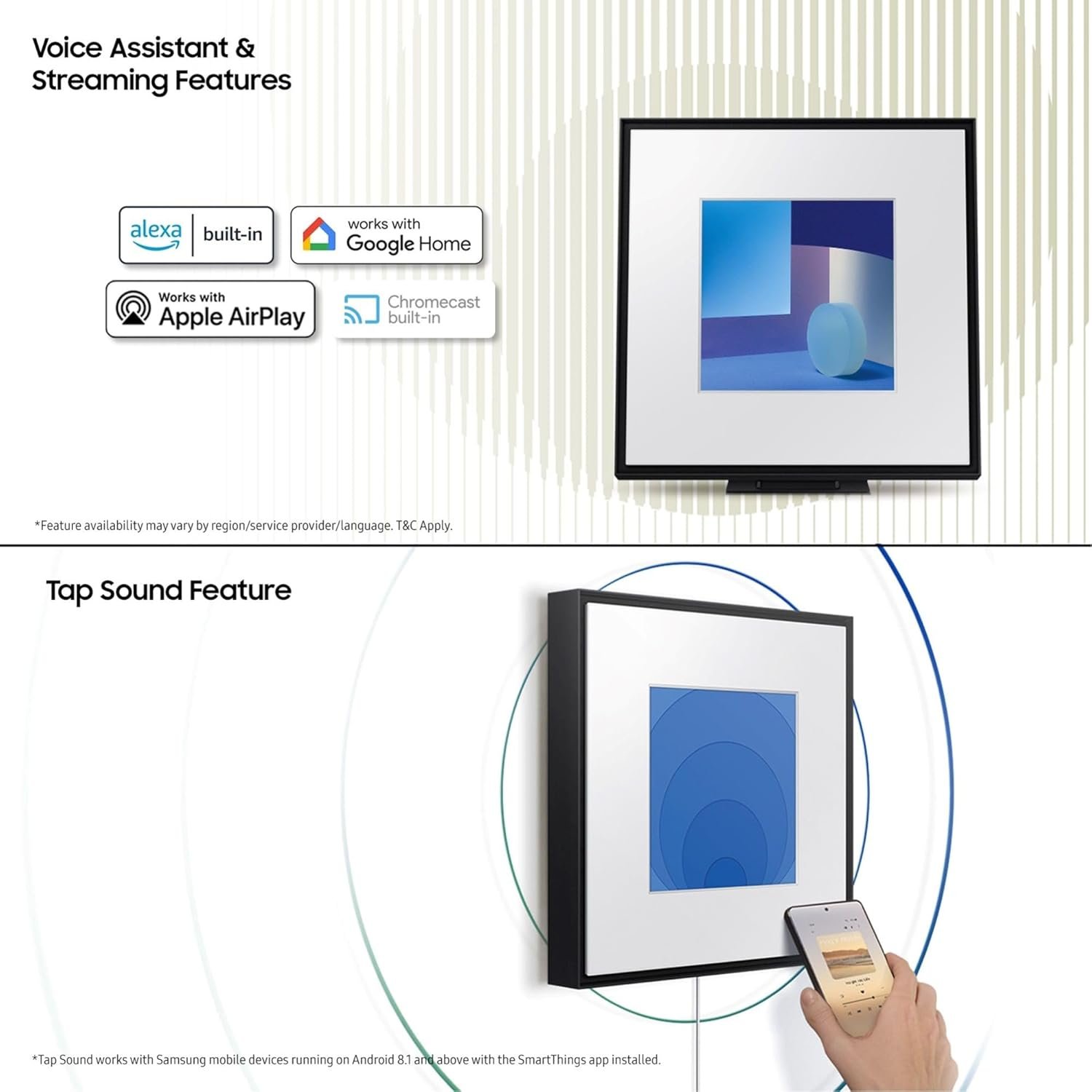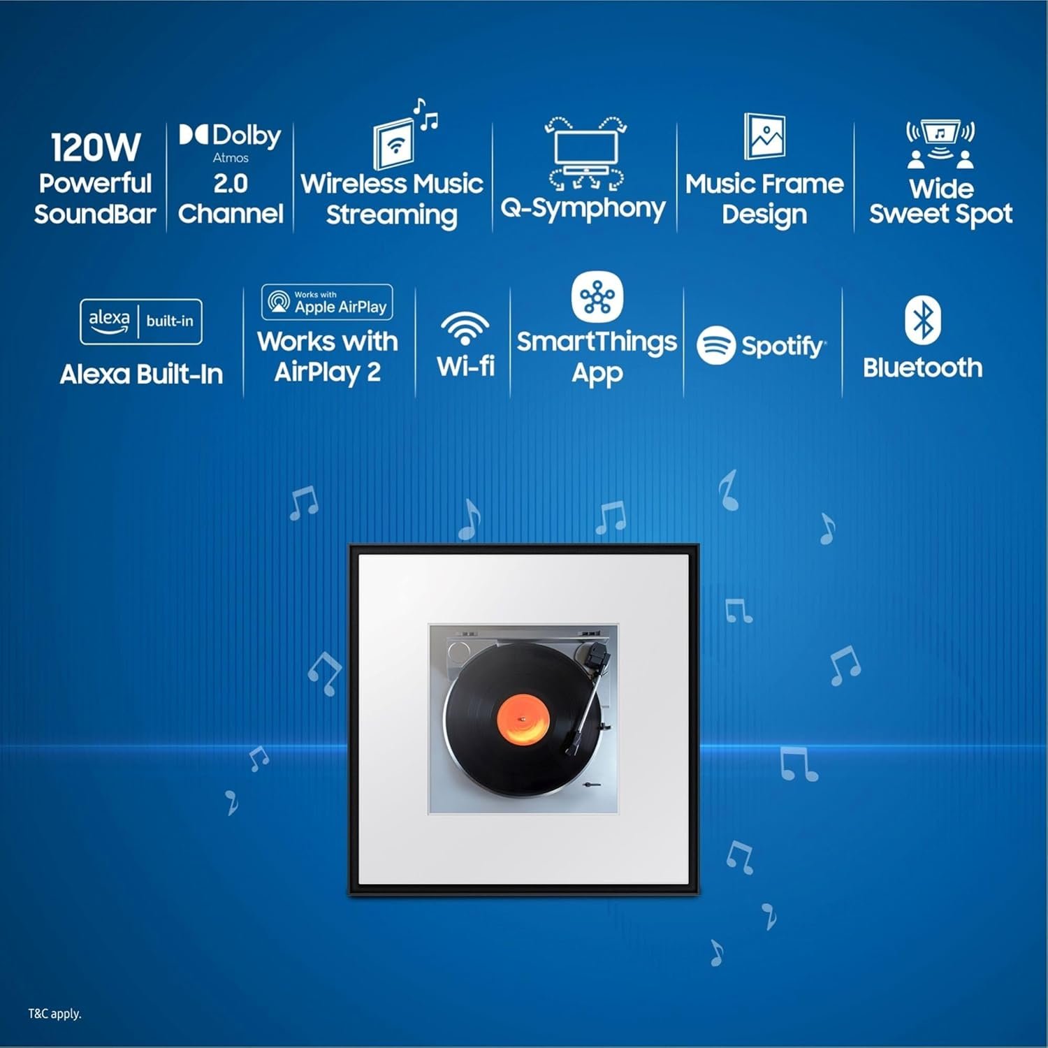 Connectivity Options: Optical In | Bluetooth | Wi-Fi | One Remote Control || Additional Special Features: SmartThings App support | Q-Symphony | Wireless Dolby ATMOS | Tap Sound | Chromecast | Spotify Connect | Roon Tested | AirPlay2 | Works with Google Assistant | Alexa Built-In | Bixby