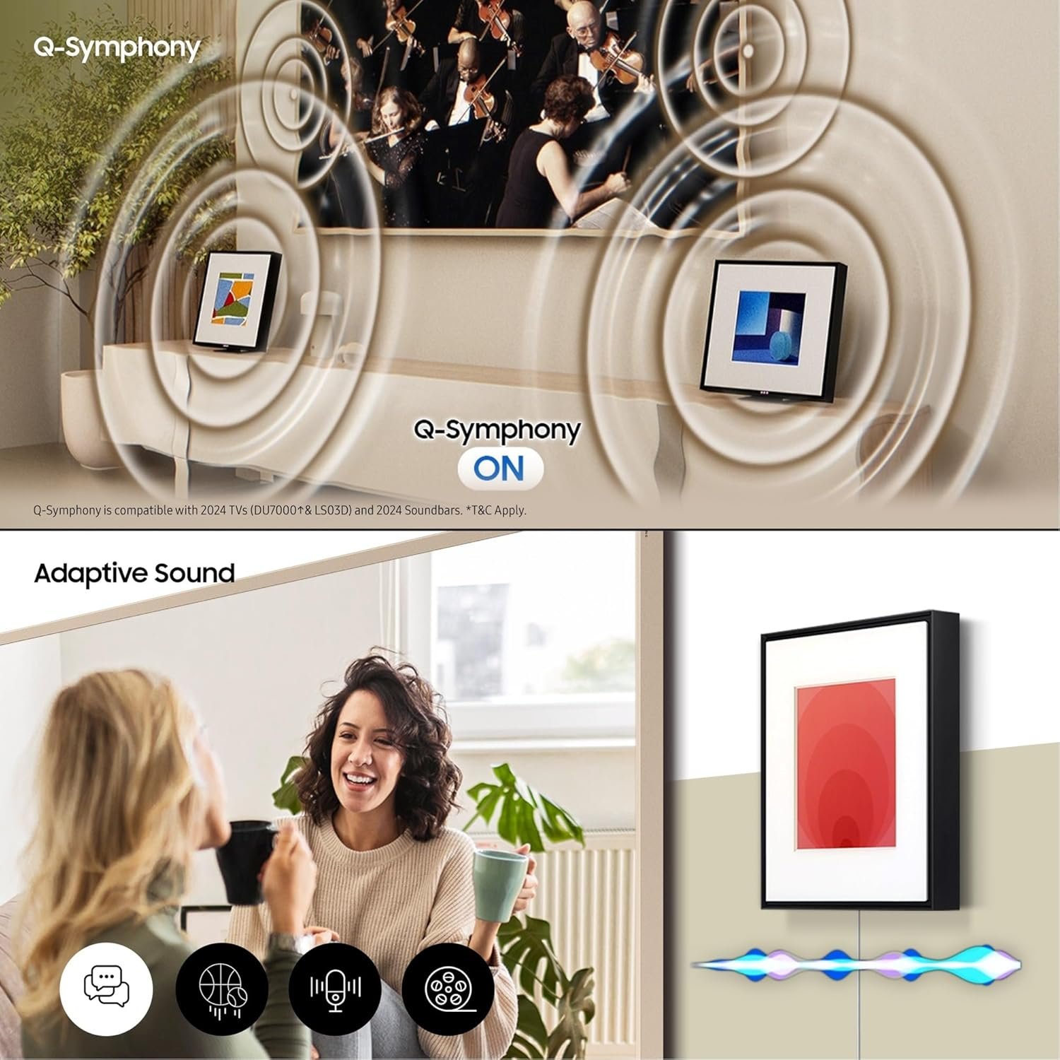 Audio Feature: Dolby Digital Plus | ATMOS Music | Voice Enhance Mode | Night Mode | SpaceFit Sound | Active Voice Amplifier | Sound Modes: Adaptive, Music, Standard