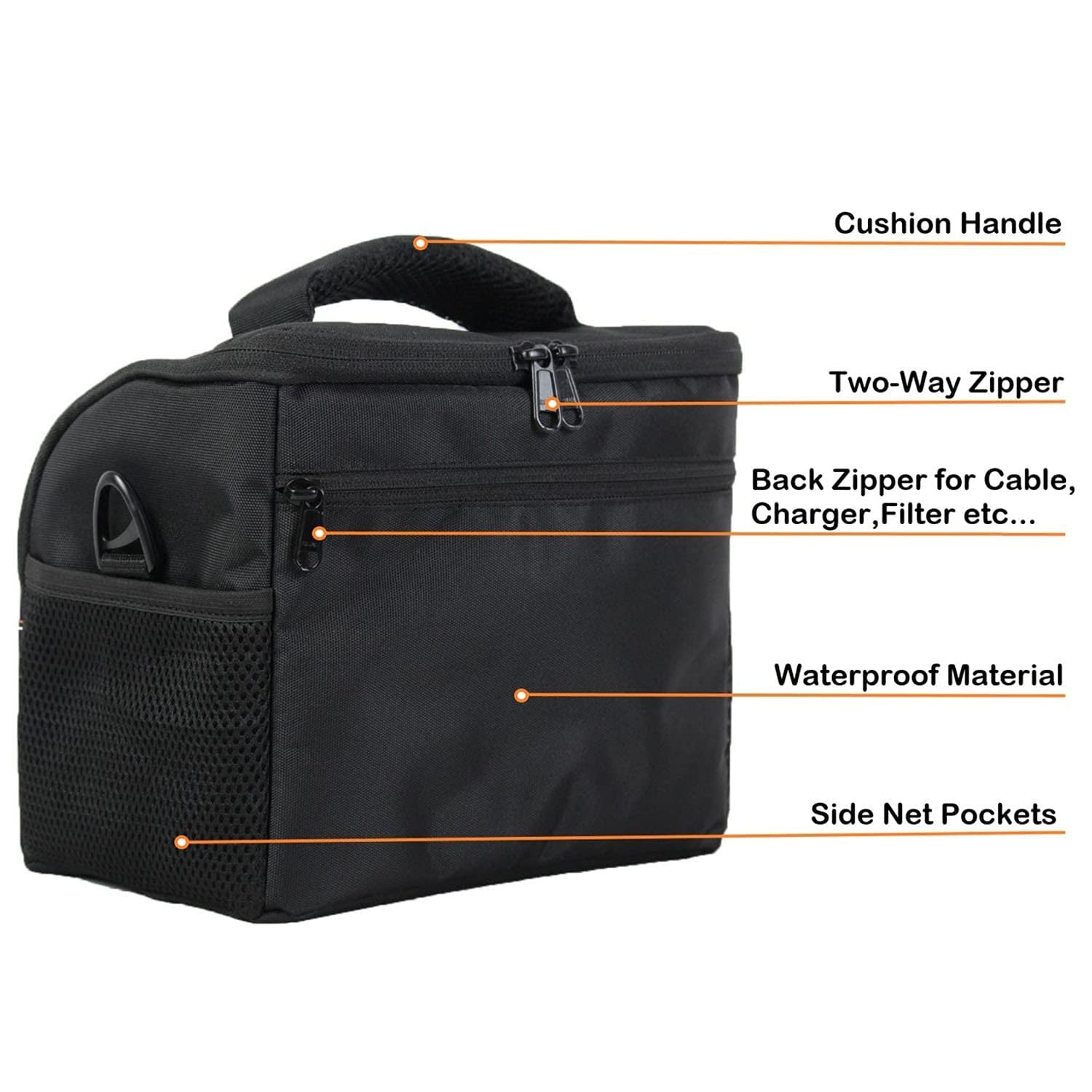 back zipper pocket for keys, cards, chargers and other storage; Inner compartment zipper net bag for SD card box, filter cloth, or cleaning kit storage.Two side net pockets. Adjustable shoulder carrying strap.