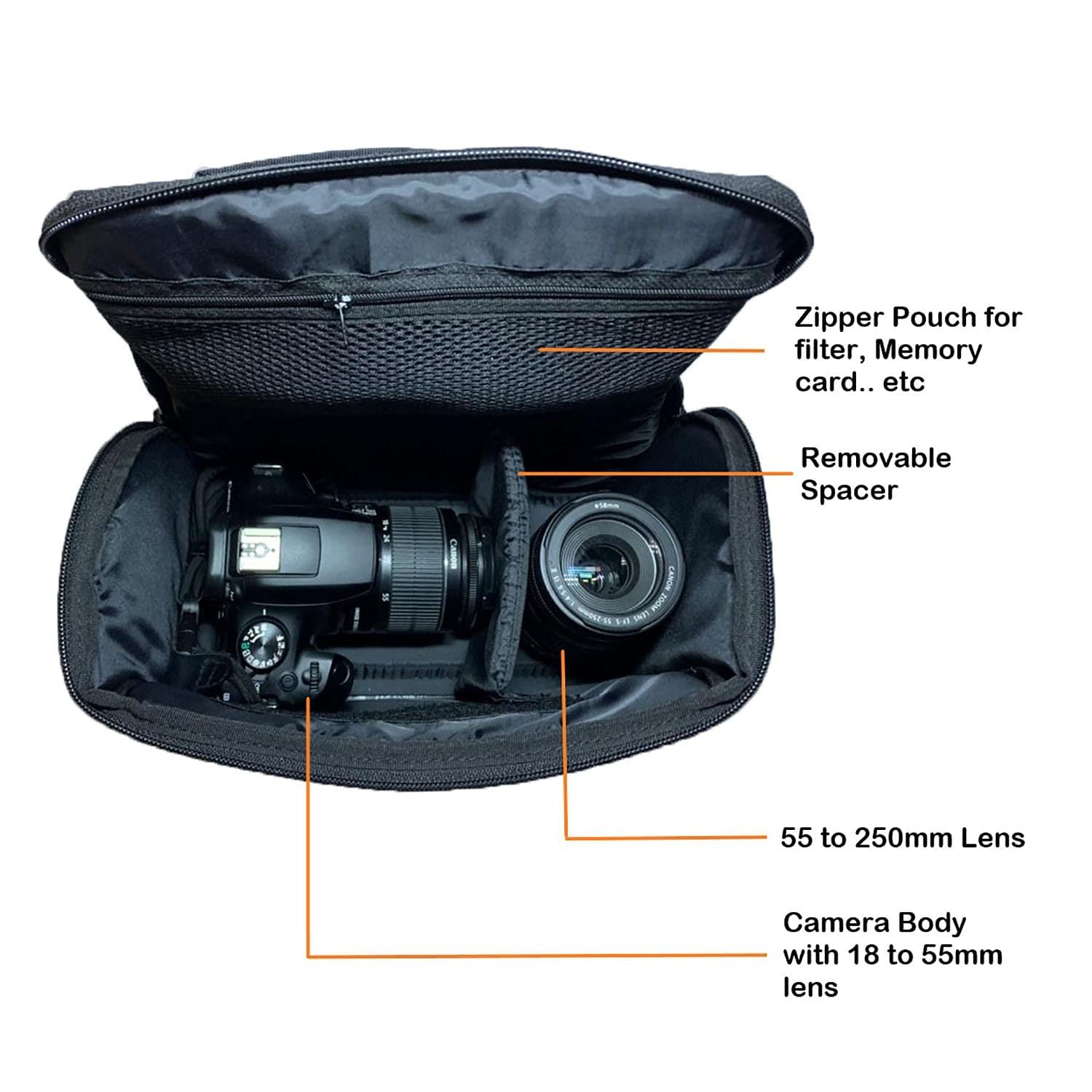 Accommodates all Entry Level & Mid Range Digital SLR Cameras with 18-55mm Lens attached + 55 to 250mm lens + Charger & cable , filter , Memory card and other accessories.Waterproof Rain Cover is included for Hustle-free outdoor activities.
