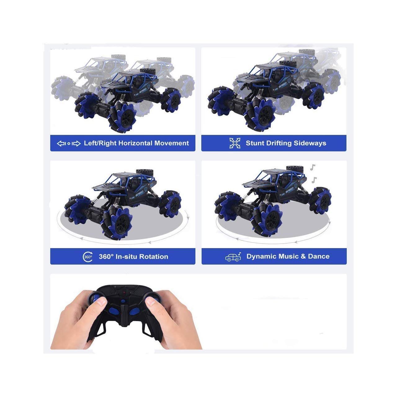 One-click Dancing The remote control car has built in 3 music songs, press the dance button, and the remote control car will demonstrate the corresponding dance according to the played music. To switch songs, just press the dance button again. All-round Drift This car can drift in all directions. Forward/backward, turn left/right is a must-have feature for each RC car. But it also has other features, it can not only left / right lateral drift, but also drift 45° in the left front/left rear, right front/right rear. 360° Rotation Press and hold the left/right button to rotate 360° in place. Not only that, but it can also rotate around a single tire in four different directions. You just need to press any one of the four direction buttons in the middle of the remote control. Multiple Directions The car can move in multiple directions with the help of remote. Unique Universal Wheels Unlike other remote control cars, its wheels have a unique design. The tires are not only better looking, but also more durable and flexible, supporting more features and allowing you to experience more fun. Spring Damping System All four tires are equipped with suspension shock absorbers, which can effectively prevent accidental impact or fall during use, reduce damage to the RC car, and extend the overall life of the RC car. Upgrade 4 Motors The front and rear dual-motors of this RC car are more powerful and can easily climb a variety of terrains, such as flat grass or roads, loose stone roads, steep rocky roads and more. It is always ready to run.