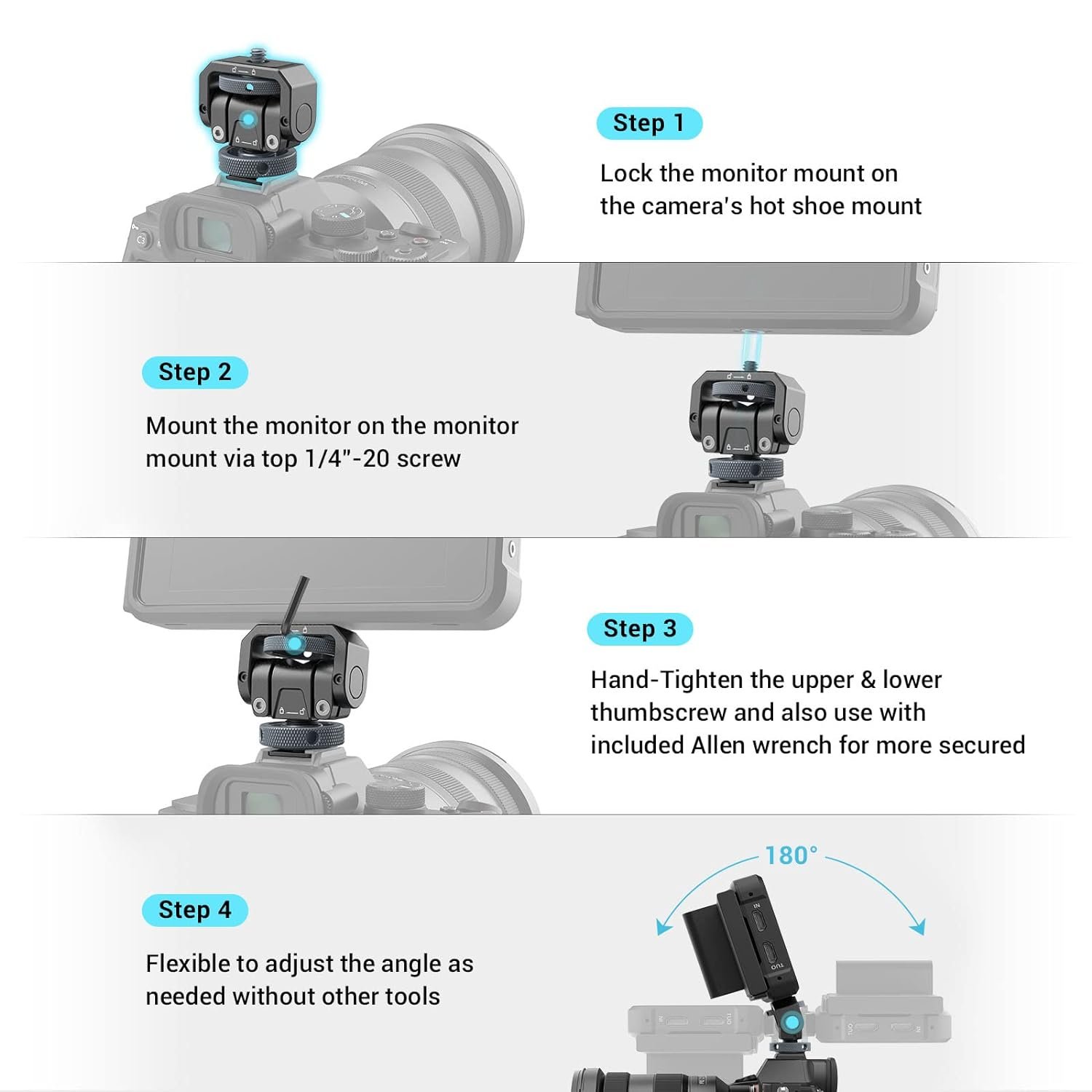 What’s Included: 1 x Monitor Mount, 1 x Allen Wrench. The 1/4″-20 threaded hole at the bottom enables it to use with Magic Arm such as SmallRig 2070 and Ball Head 2948, etc.