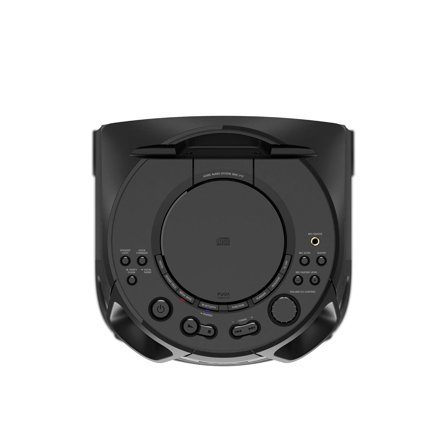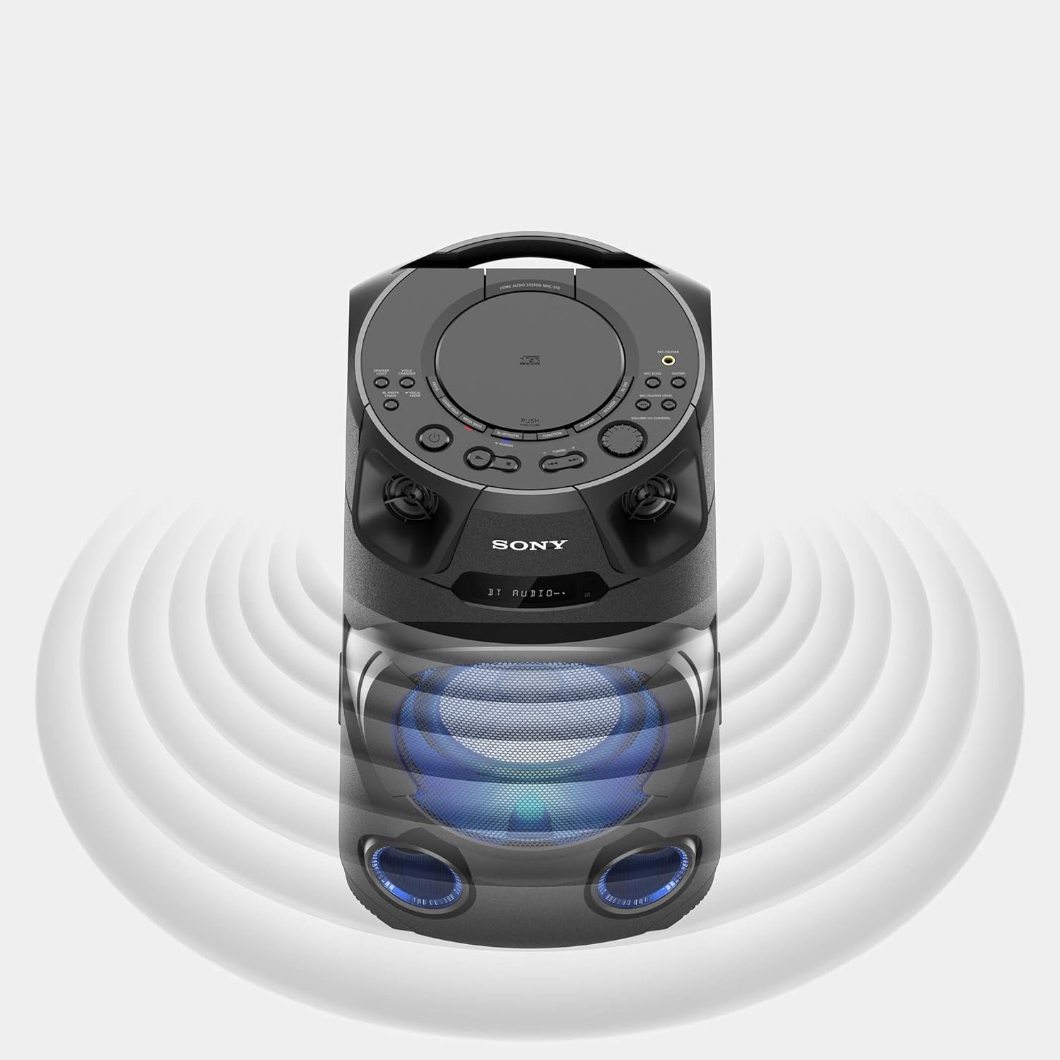 The MHC-V13 has built-in carry handles so you can take it to a friend’s house or easily move the party between rooms.