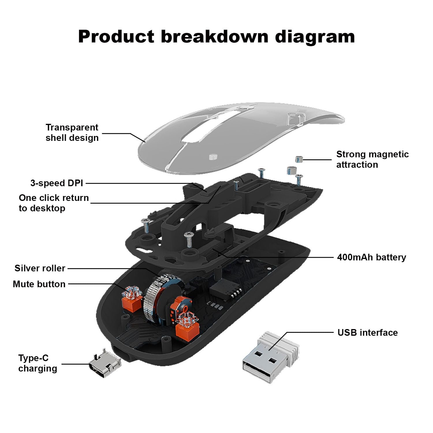TRIPLE-MODE CONNECTION (BT5.1+BT5.1+2.4GHz) :: This AF wireless transparent mouse boasts an advanced Bluetooth 5.1 chip, ensuring a stable and low-latency connection. It also supports a reliable 2.4GHz wireless connection with plug-and-play convenience—no drivers needed. Switch effortlessly between up to three connected devices by touching the switch on the back.