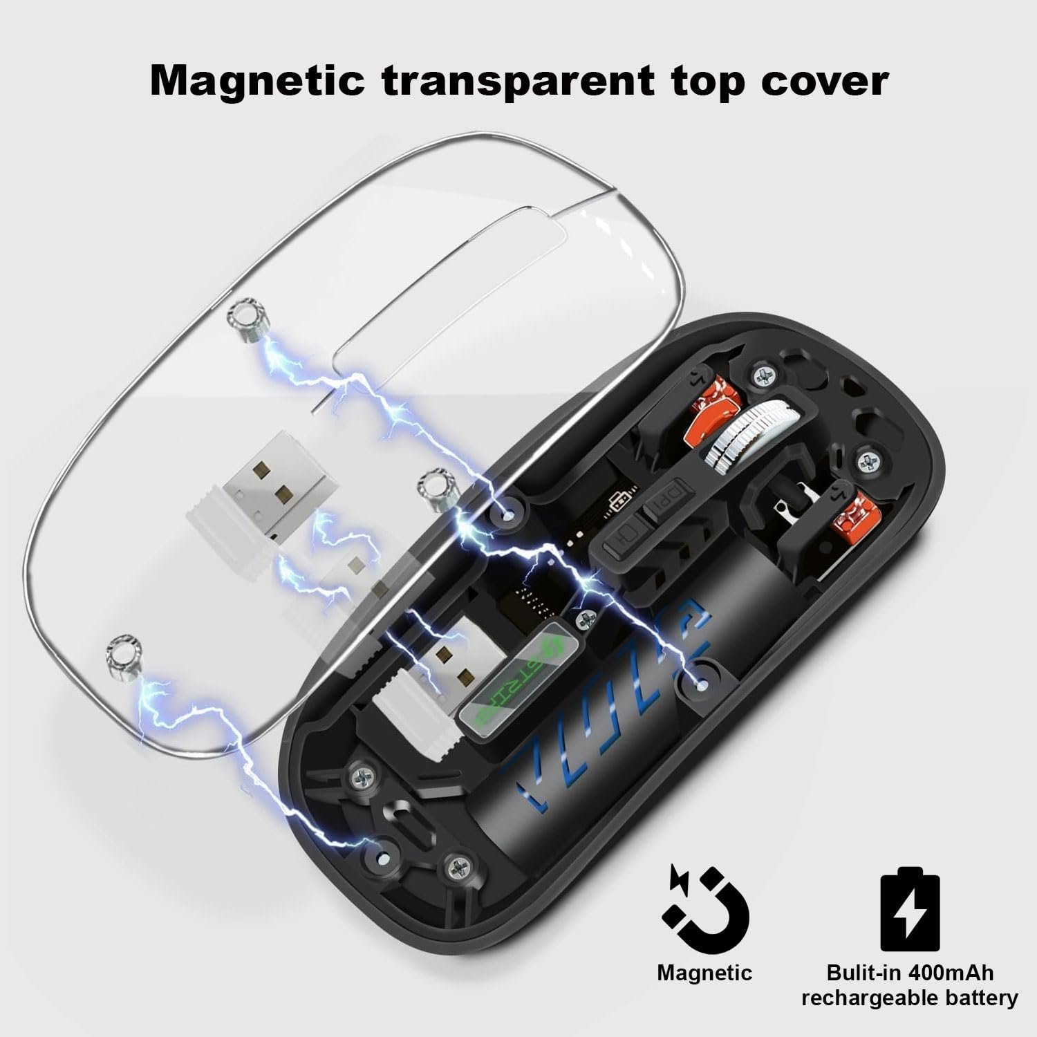 BUILT IN RECHARGEABLE BATTERY :: The STRIFF transparent mouse features a built in high-performance rechargeable 400 mAh battery, providing an impressive 30 days of usage on a full charge. The automatic hibernation mode minimizes power consumption, effortlessly awakening with a simple button click.
