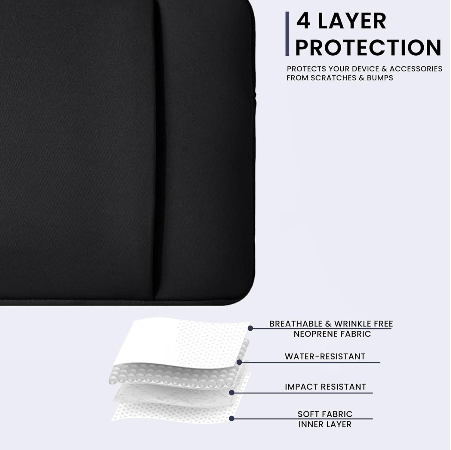 Features a neoprene foam padding layer and fluffy fleece fabric lining for bump and shock absorption and protection of your computer from accidental scratches.