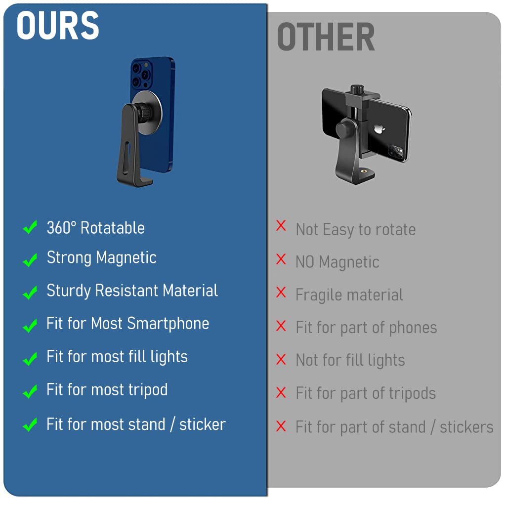 DESIGNED FOR IPHONE: This smartphone tripod is compatible with MagSafe function, so it can be used with the full range of iPhone 12/13/14 without the case. Non-MagSafe models can be used with a magnetic phone case or magnetic ring. We provide a extra metal rings for other smartphone models, making this magnetic tripod mount adapter more versatile.