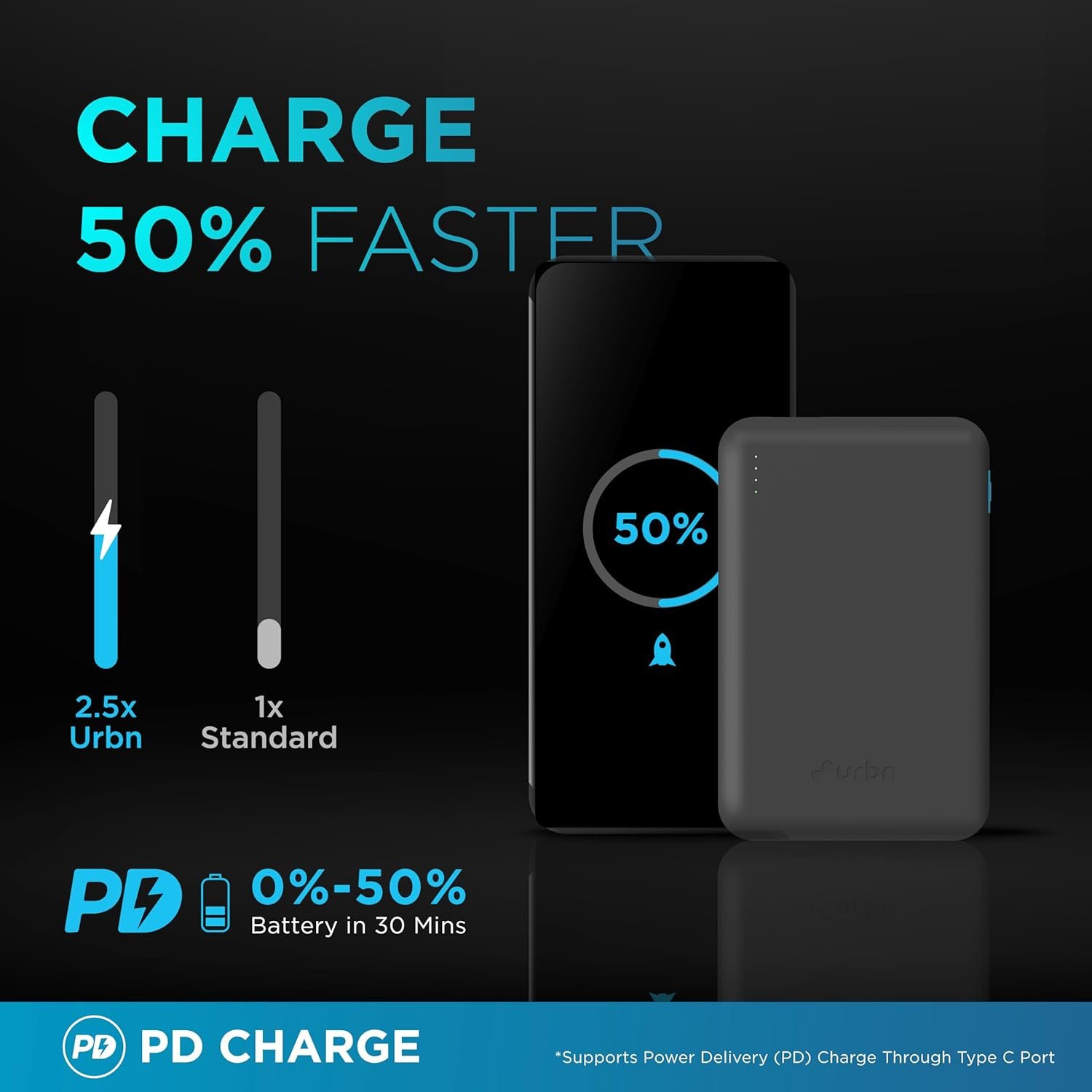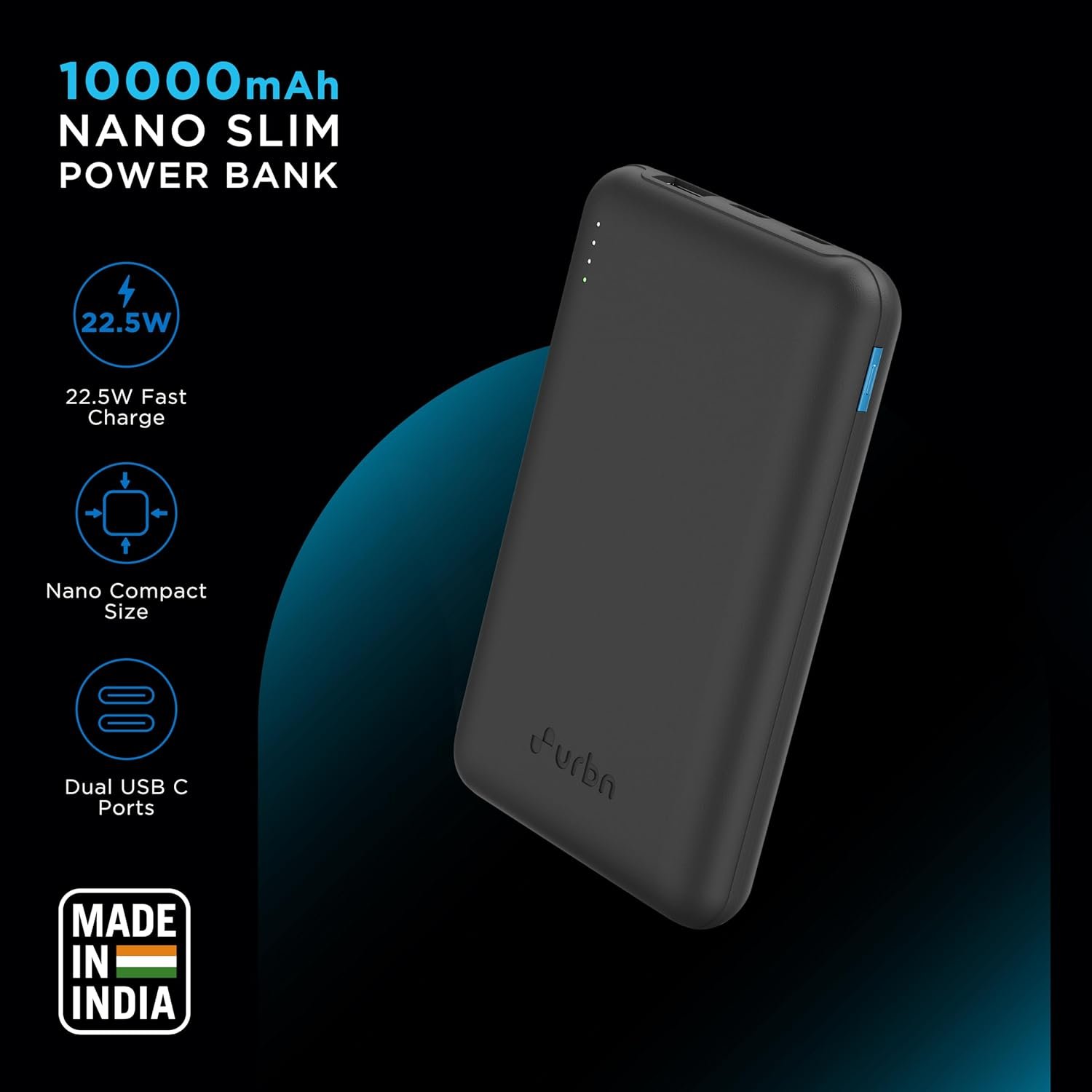 URBN 10000 mAh Nano Slim Power Bank | 22.5W Fast Charging | Type C PD (Input& Output) | Made in India | Two Way Fast Charge | for iPhone, Android & More (Black)