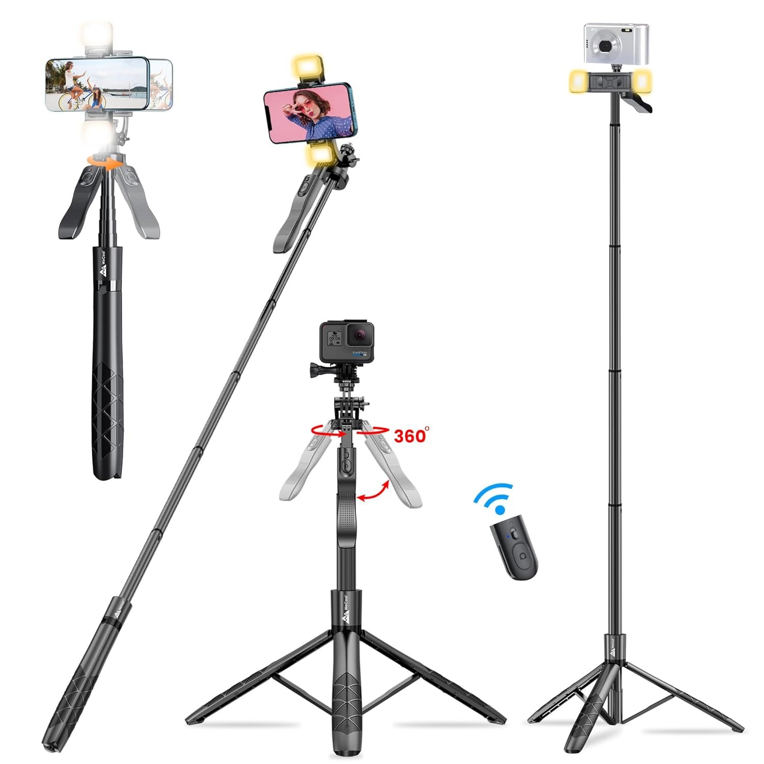 Versatile Compatibility: Equipped with 4/1 interface, this Selfie Stick Tripod is compatible with multiple devices including GoPro, camera, ring light. Tripod Selfie Stick with Detachable LED Light gives additional Brightness to your photos & videos