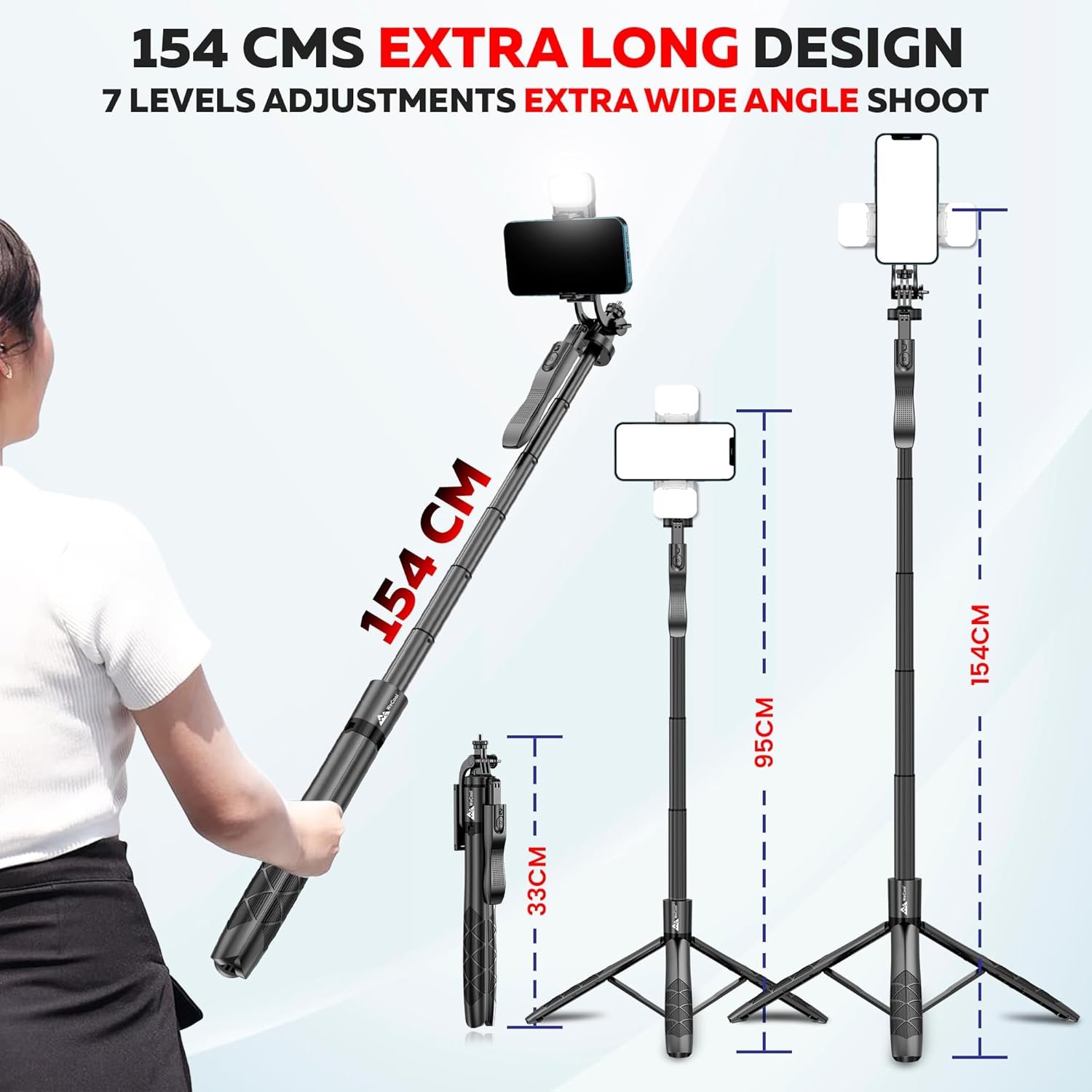 Upgrade Your Photography Game: Our Long selfie stick with light & tripod stand has 6 Adjustable Sections, extending from 33cm to 163cm. Capture wide-angle shots and faraway moments effortlessly, perfect for landscapes and group photos.